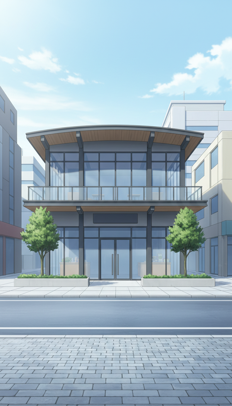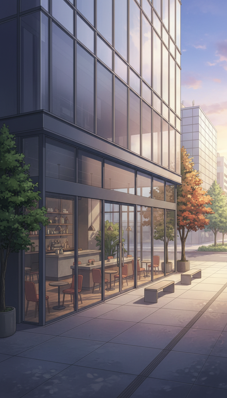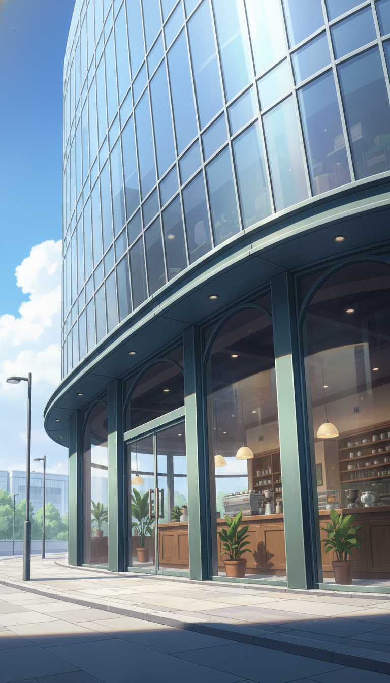 スタイリッシュなガラス張りの建物が印象的な、都会的カフェの背景。