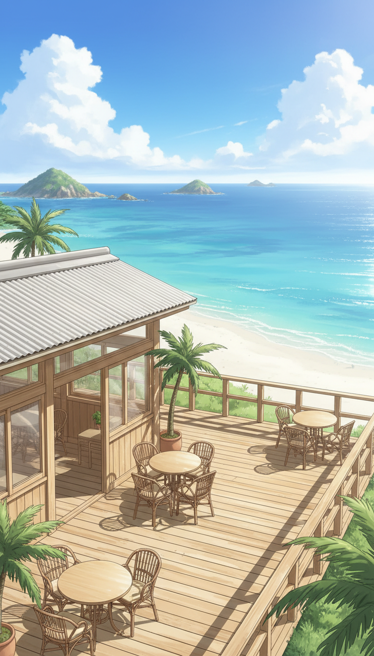 海辺のテラスカフェ|青空と潮風に包まれた南国の休日