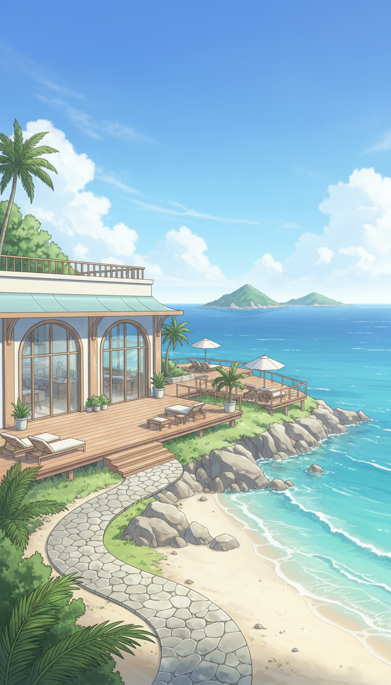南国の海岸線に建つ、潮風を感じるリゾート風のカフェデッキ。