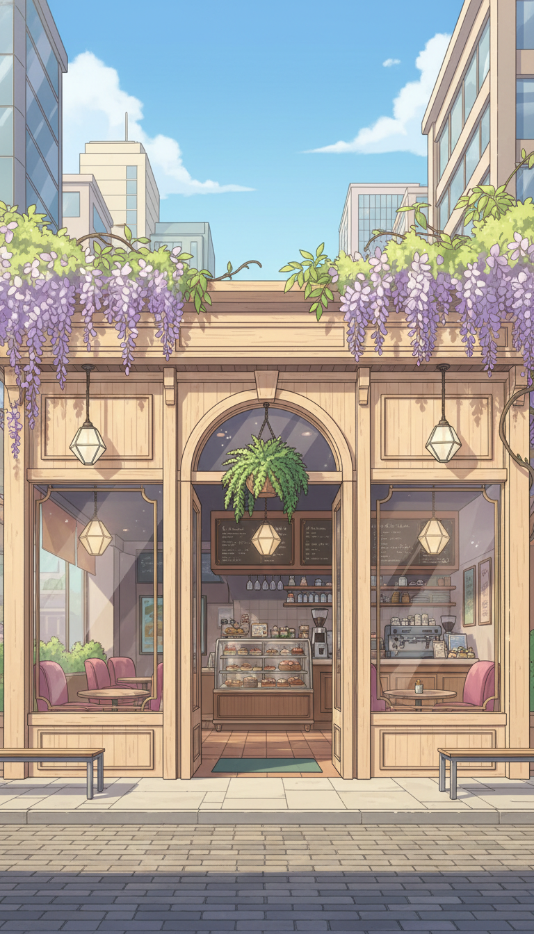 花と木の温もりに包まれた、日常を感じるアニメ風カフェの背景。