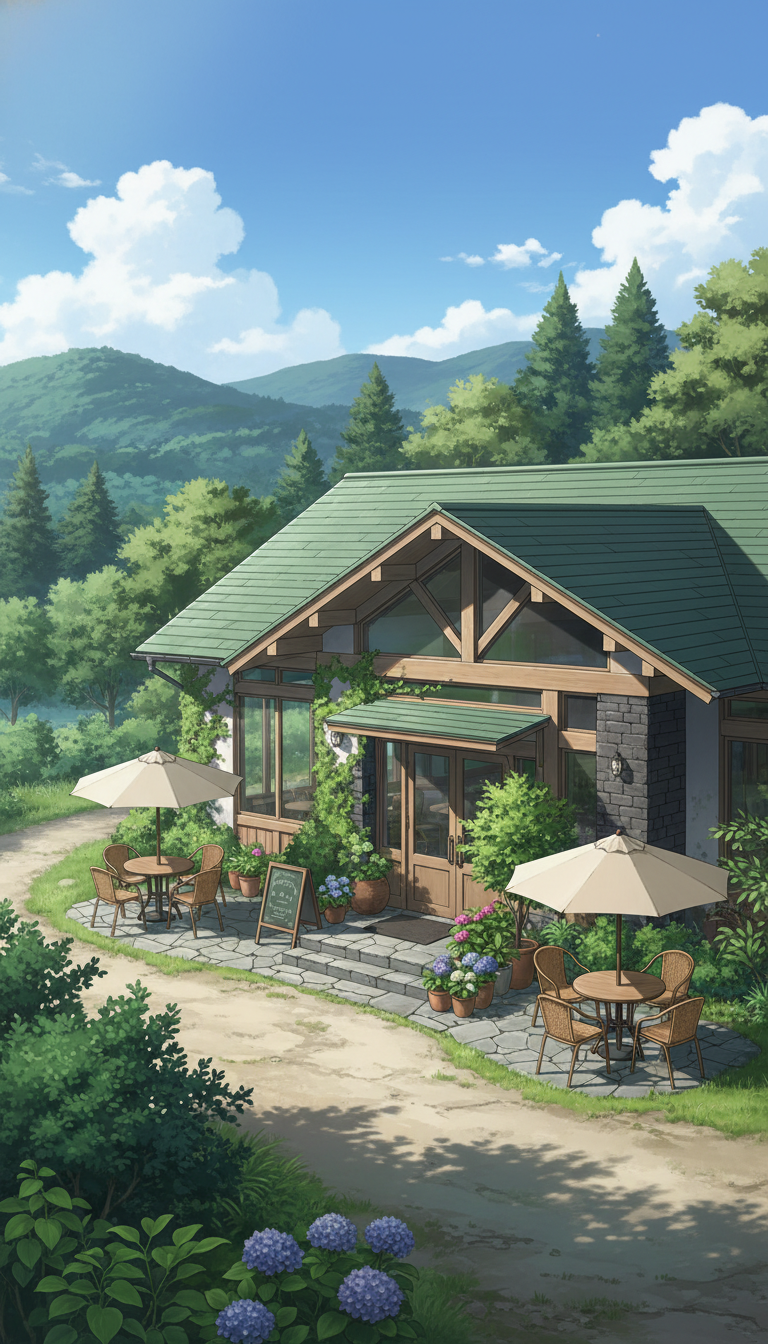 山あいの街に佇む、緑に包まれた静かな路面カフェの風景。