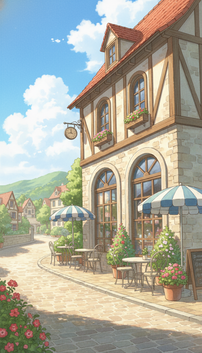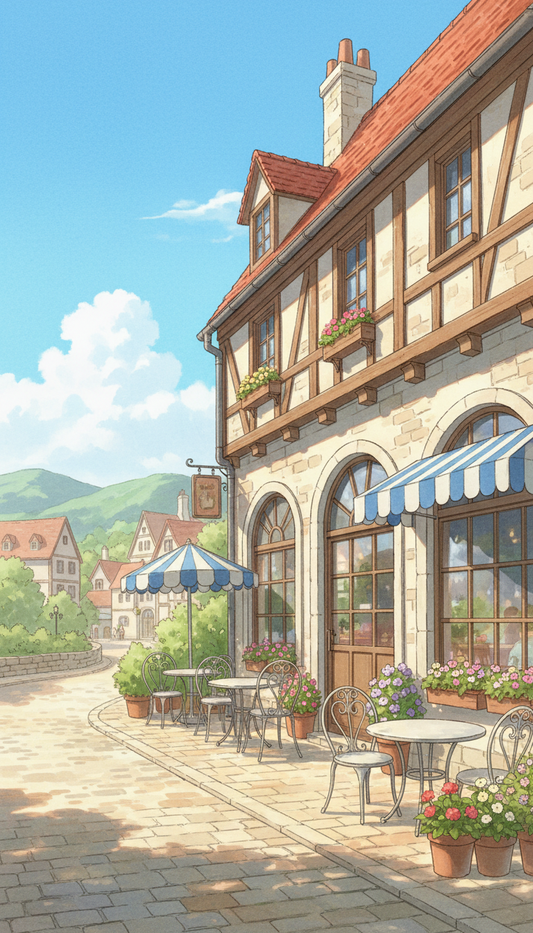 赤い屋根と花壇が印象的な、ヨーロッパ風カフェのアニメ背景。