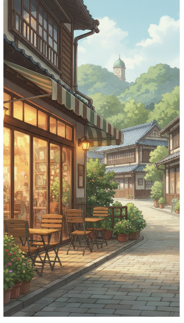 柔らかな光が溢れる古風な通りに並ぶ、ノスタルジックな和カフェの風景。