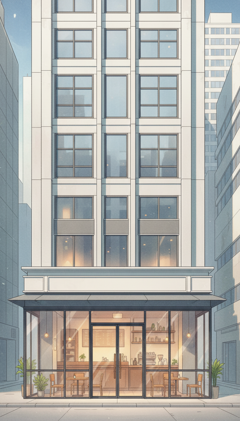 モダンビルのカフェ外観|シンプルで洗練された都市の一角