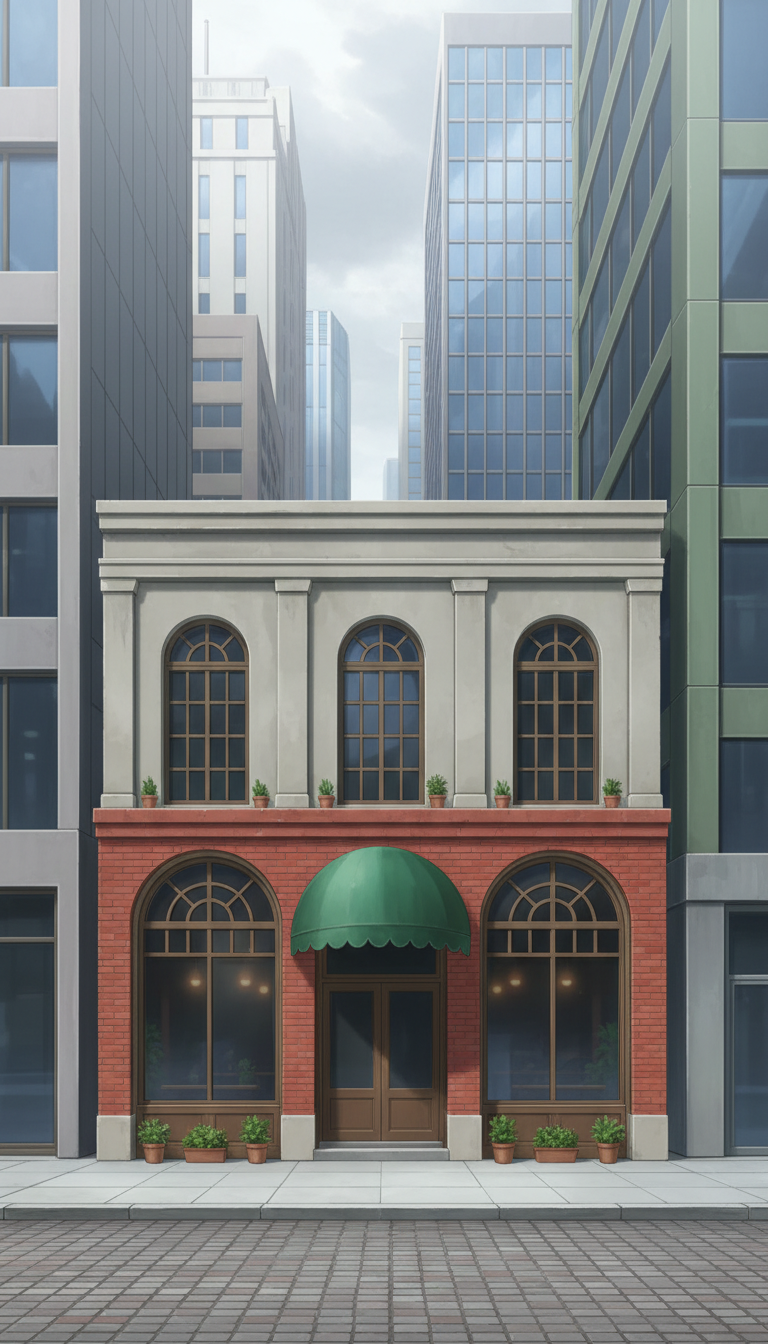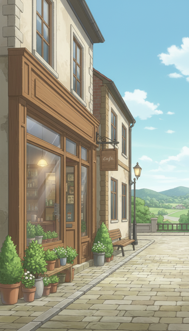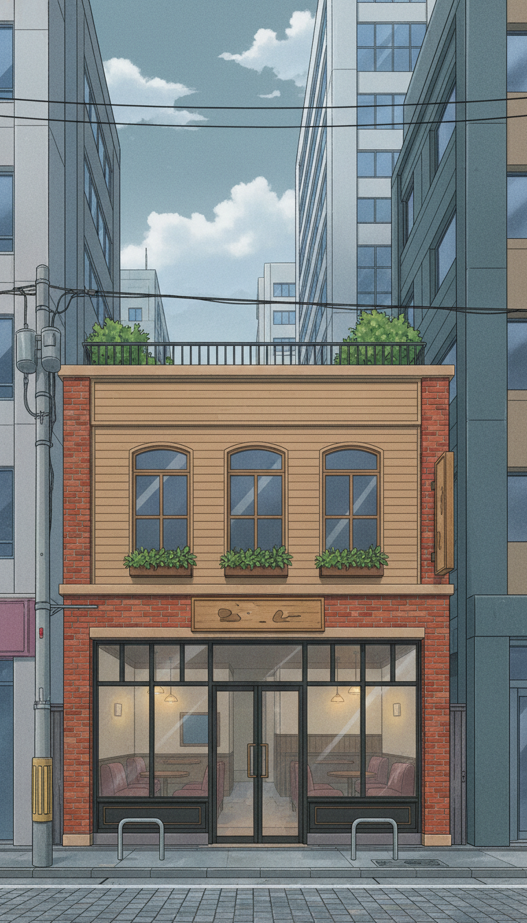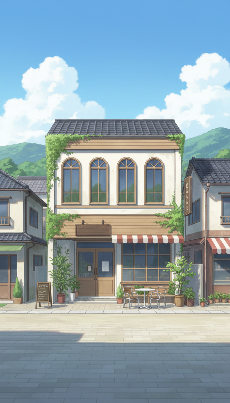 カフェの外観の背景イラスト(縦長/9:16)を無料で配布します。スマホ向け作品に便利な縦長の素材です。ウェブトゥーン/ゲーム/漫画、その他広告を含めてご活用ください。商用利用可&無償、トレース、加筆修正可。