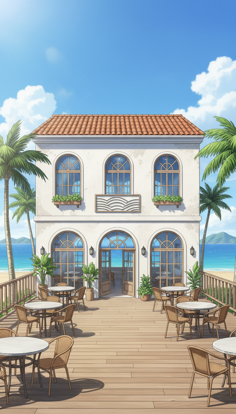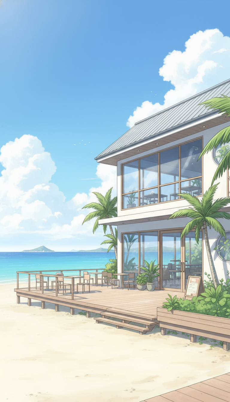 白砂と青い海が広がる、開放的でリゾート感あふれる海沿いカフェの背景。