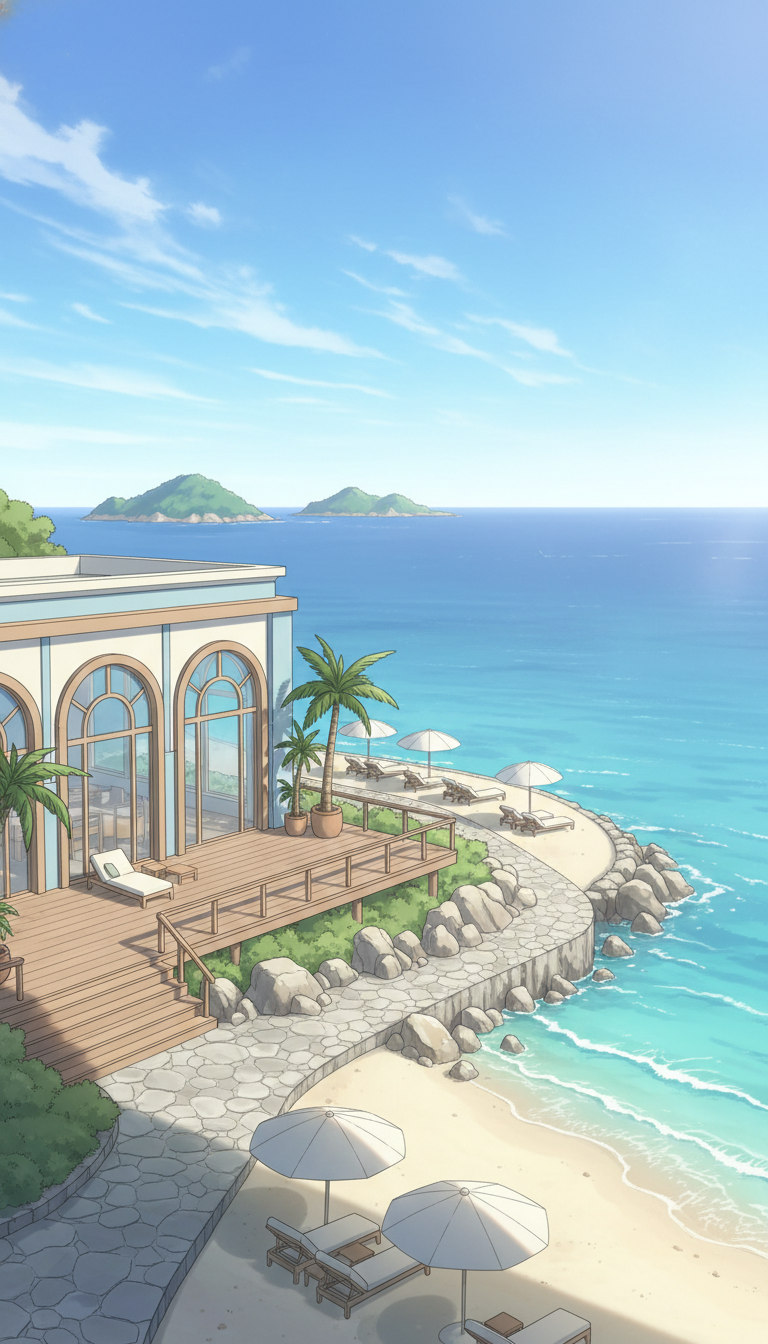 海岸線に沿って建つラグジュアリーなリゾートカフェの背景イラスト。