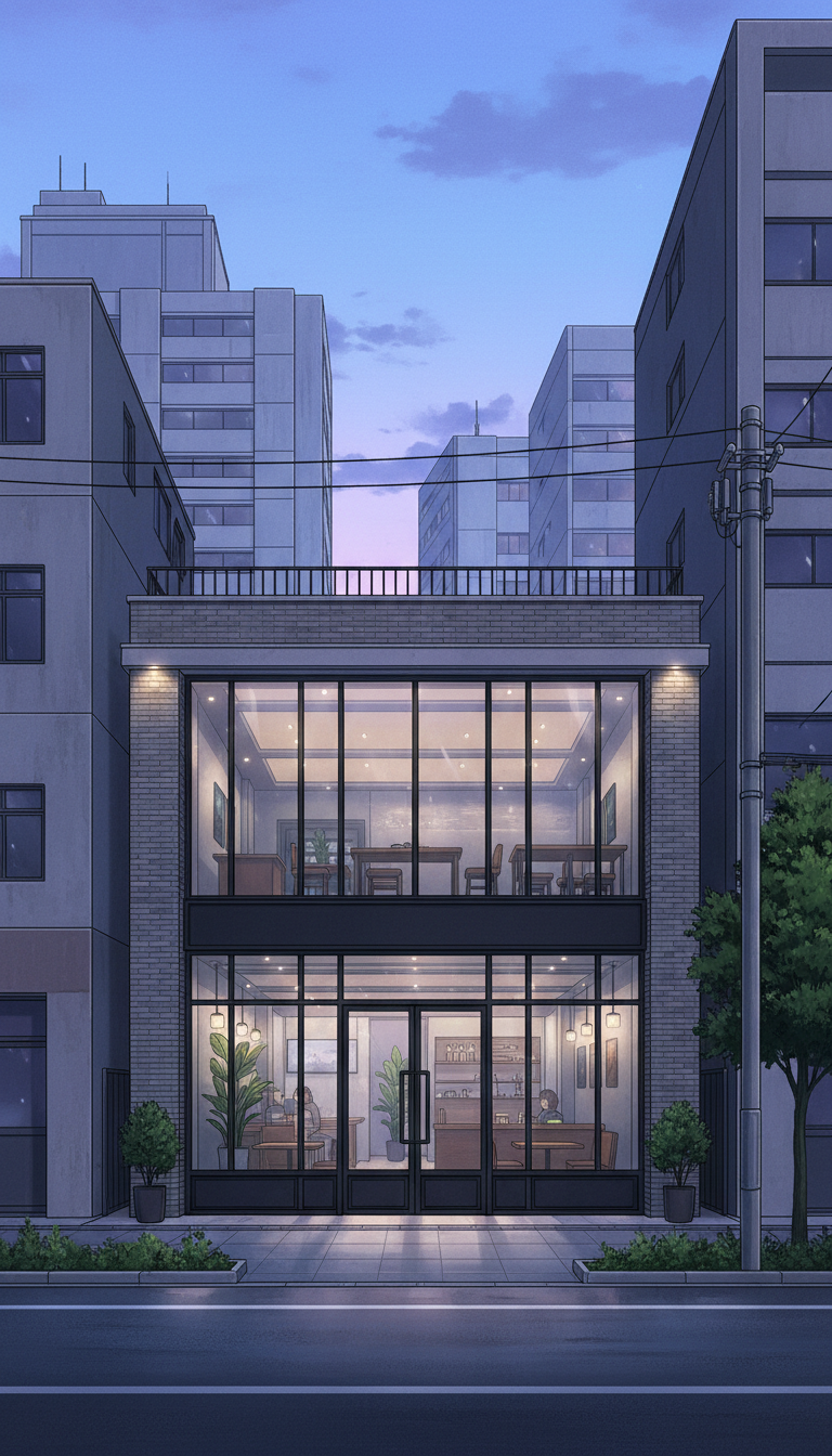 透明感あるガラス外観と都会の光を反射する、洗練されたカフェ外観。