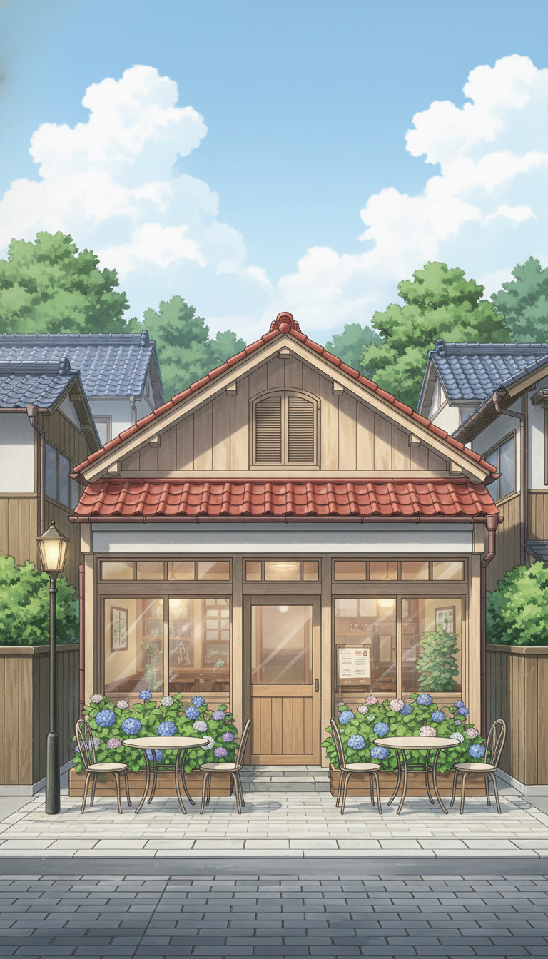 小さなテラス席と紫陽花が彩る、初夏のやさしい日差しに包まれた街角の一枚。