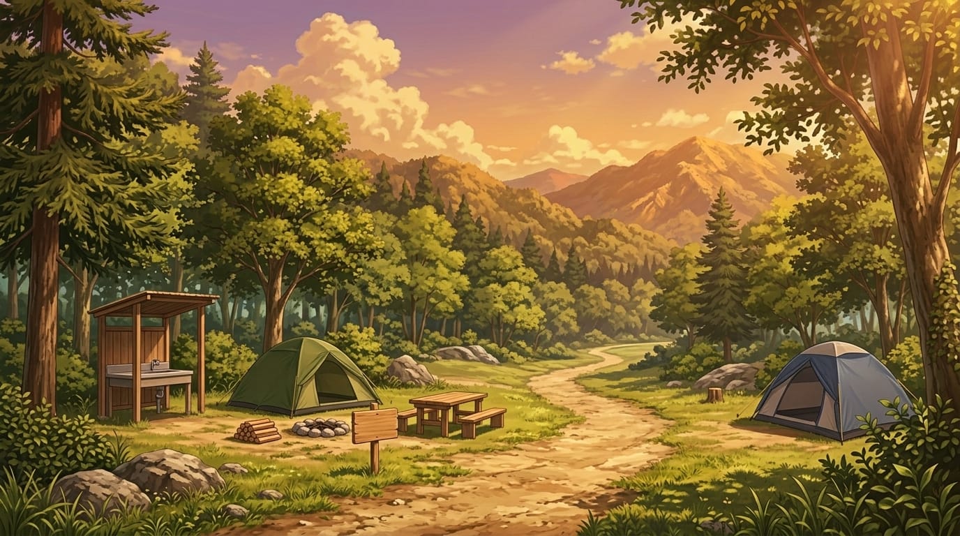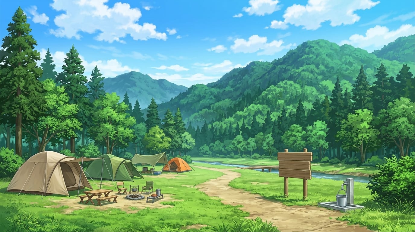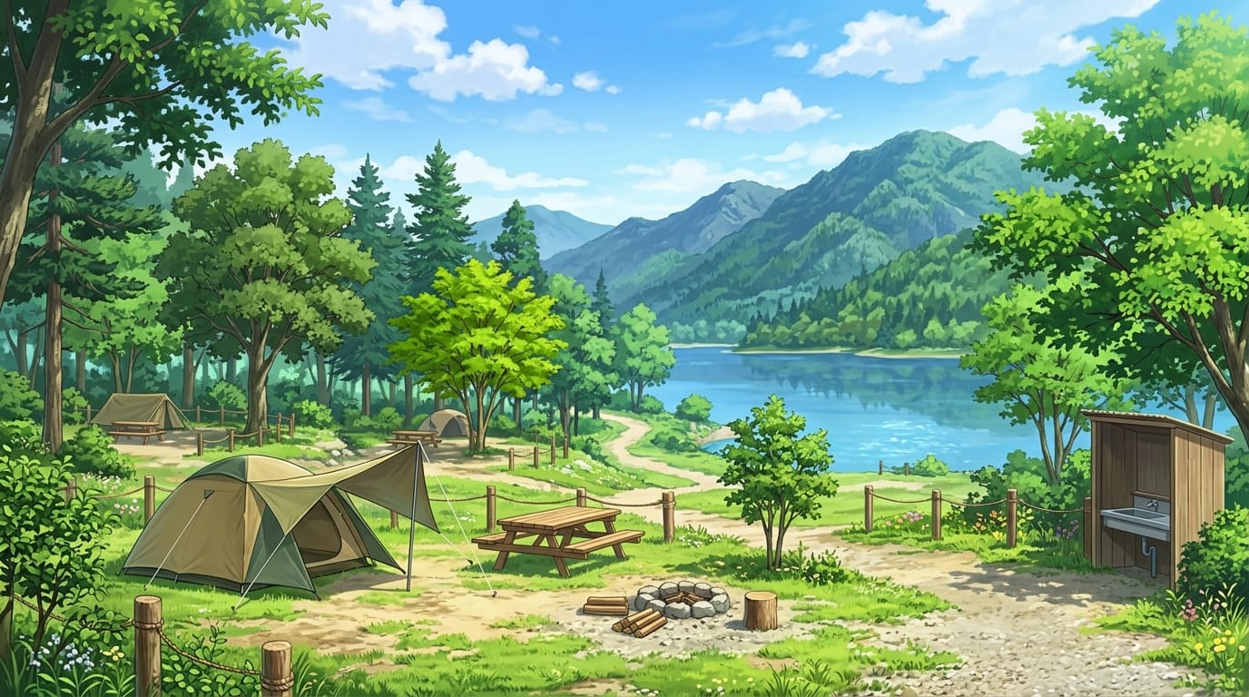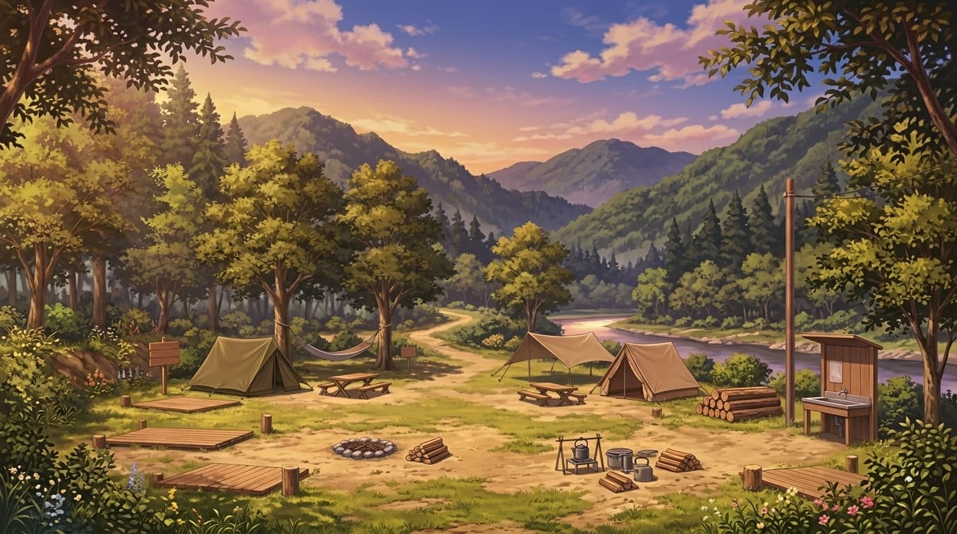キャンプ場の背景イラスト素材を無料配布。16:9の横長構図でPC向け作品に使いやすい背景イラストです。漫画・Webtoonやゲーム背景として商用・トレース利用もOK!