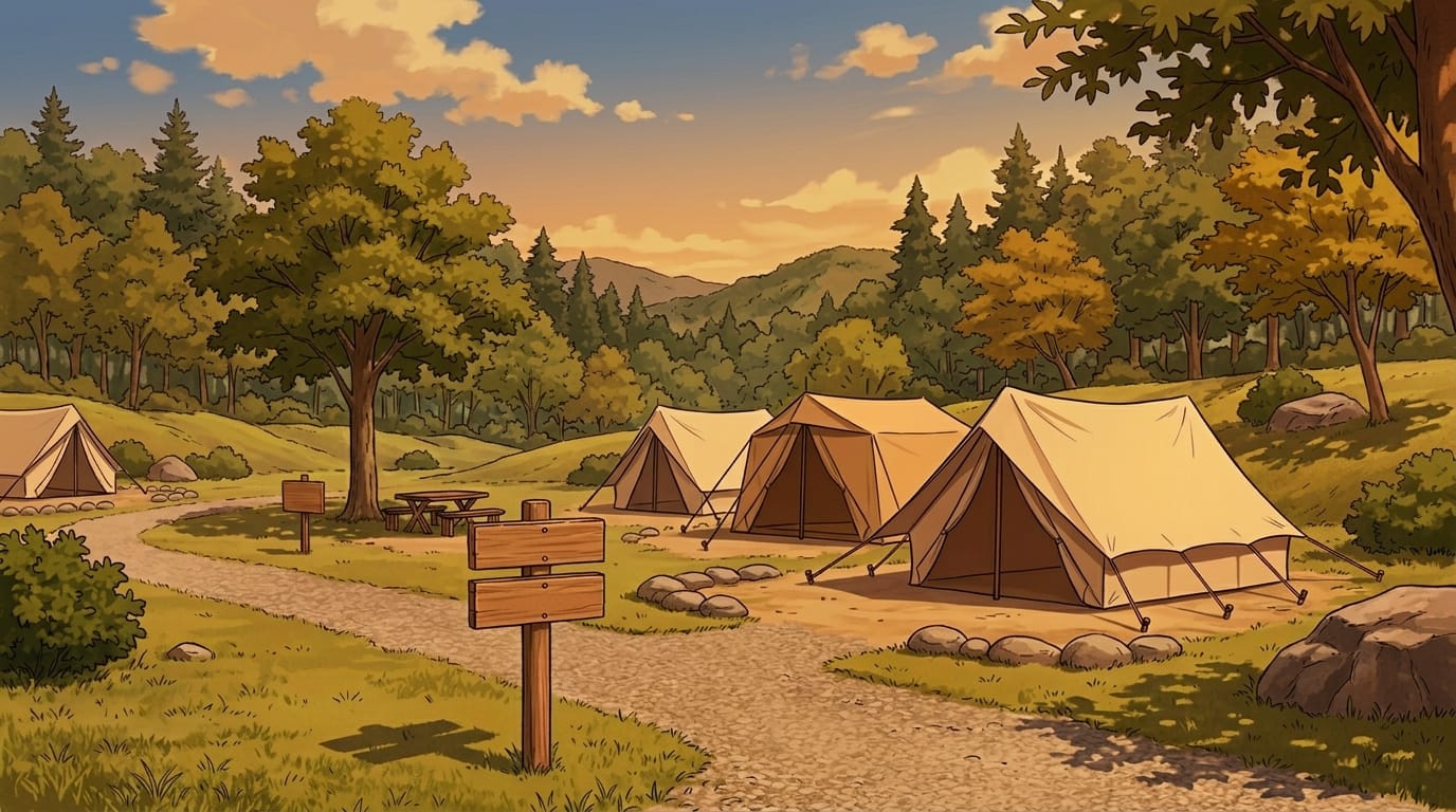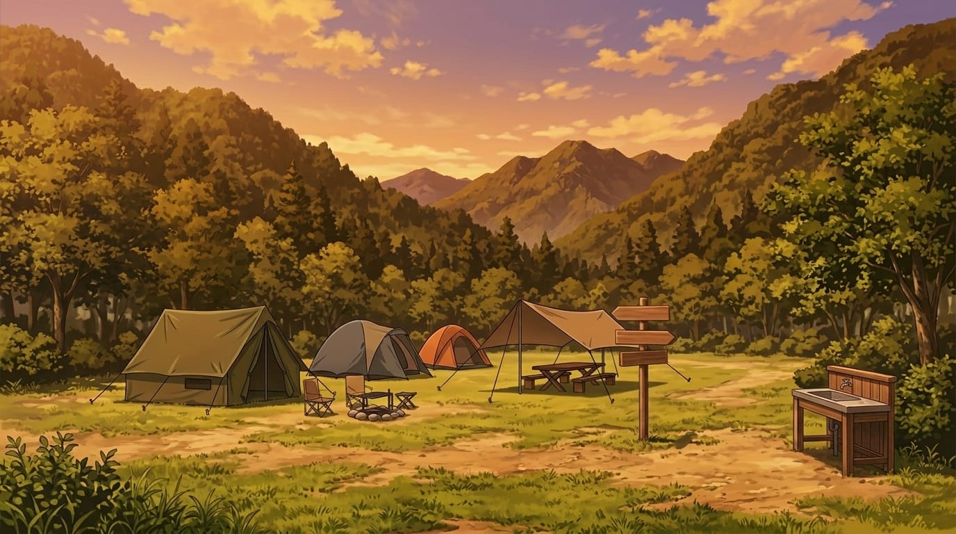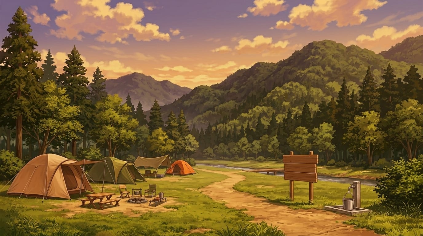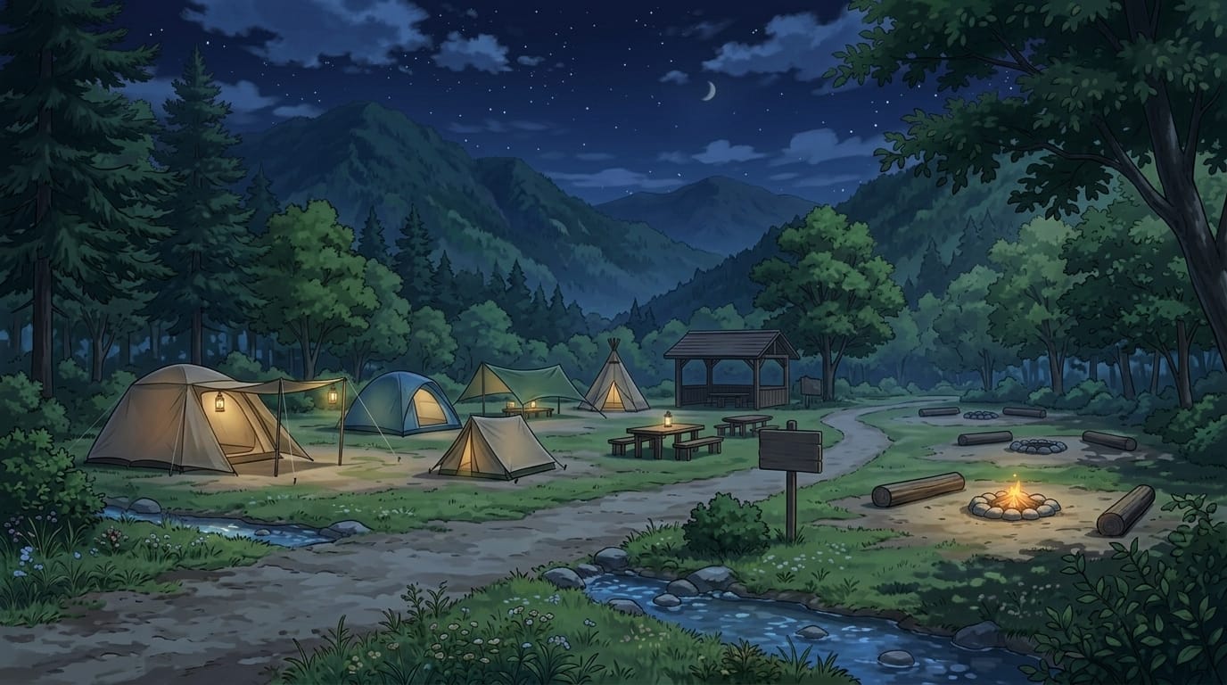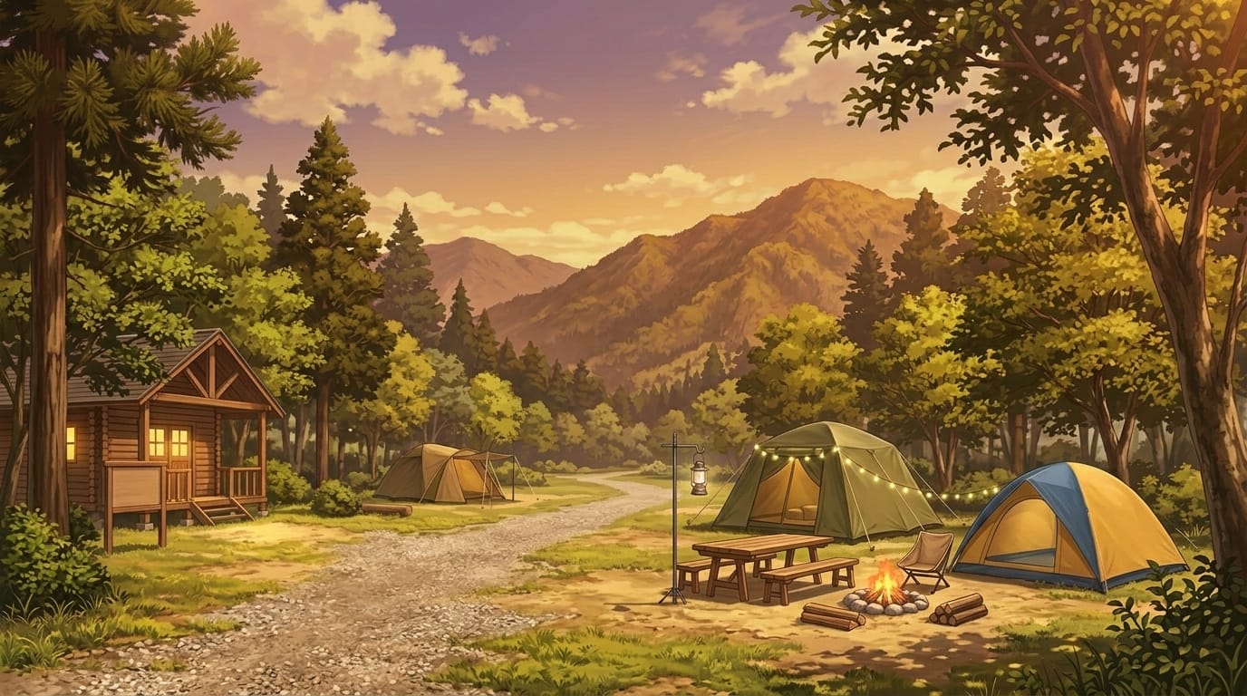 キャンプ場の背景イラスト素材を無料配布。16:9の横長構図でPC向け作品に使いやすい背景イラストです。漫画・Webtoonやゲーム背景として商用・トレース利用もOK!
