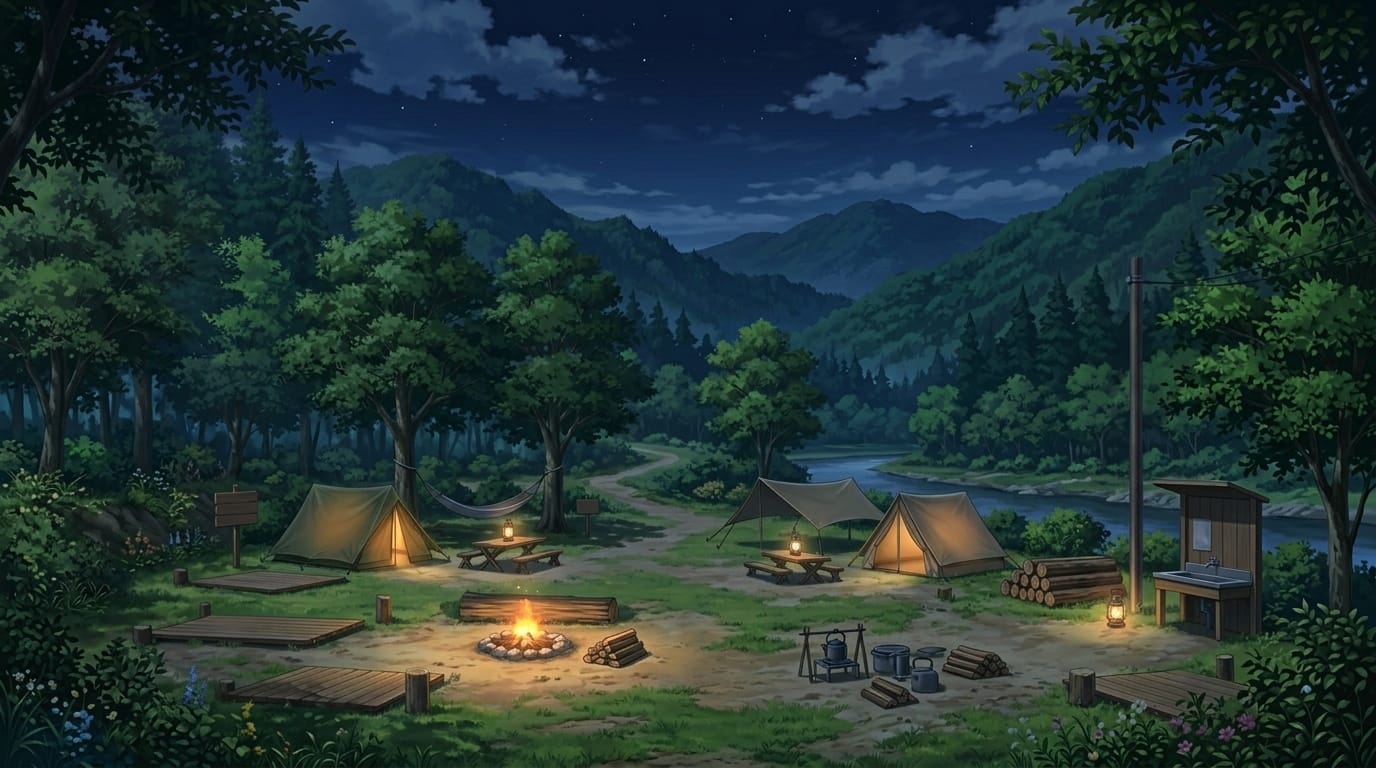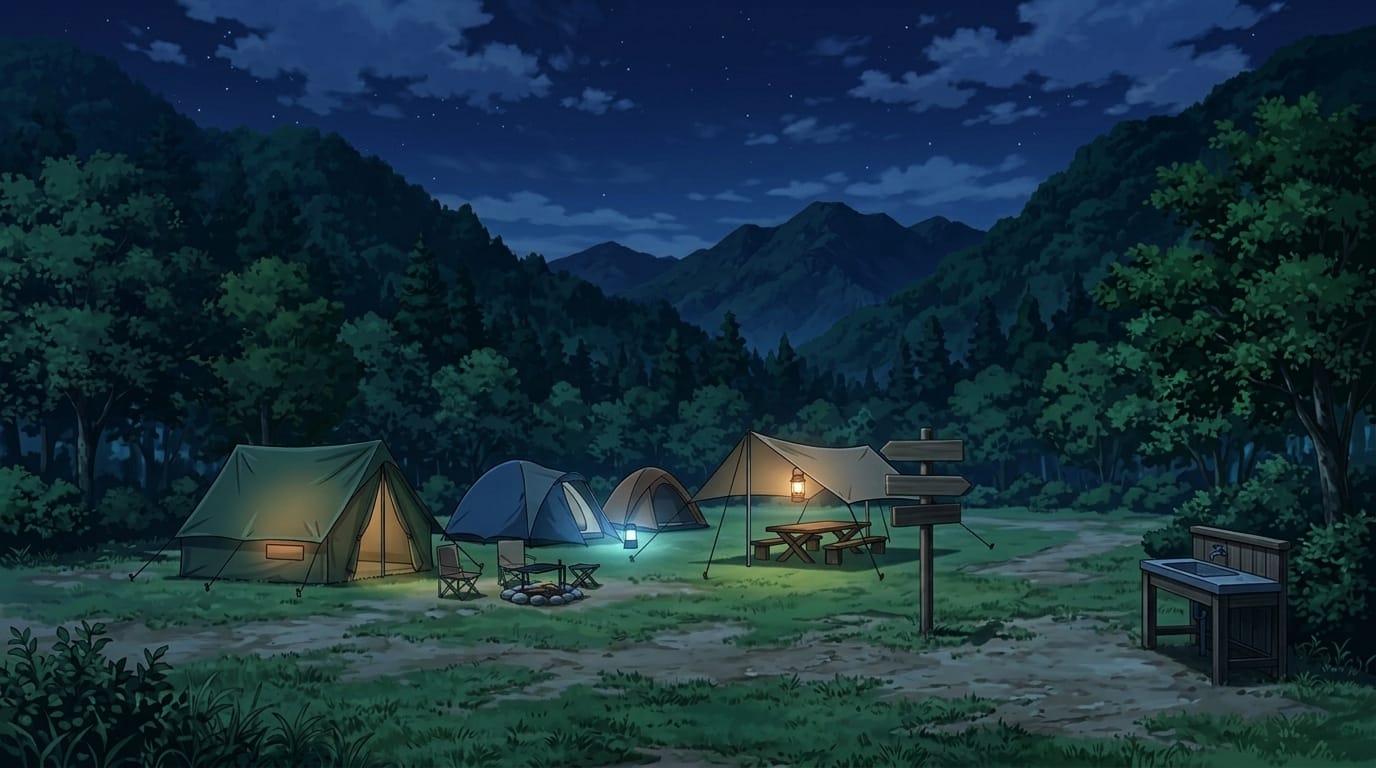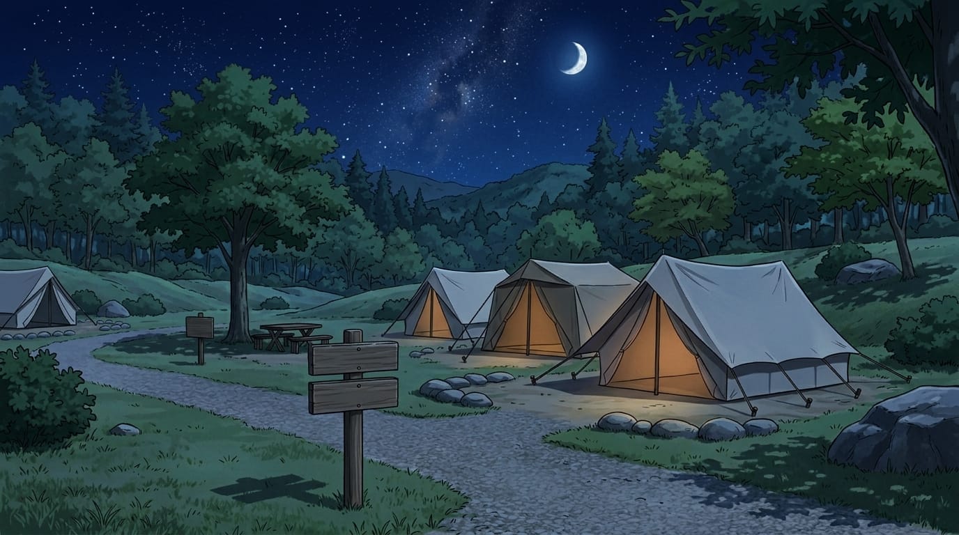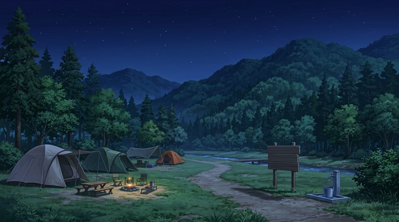 キャンプ場の背景イラスト素材を無料配布。16:9の横長構図でPC向け作品に使いやすい背景イラストです。漫画・Webtoonやゲーム背景として商用・トレース利用もOK!