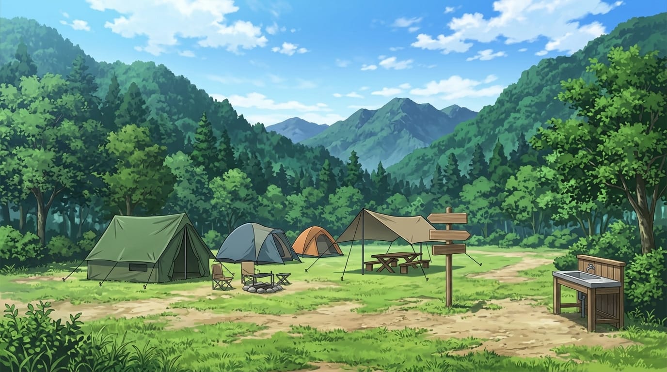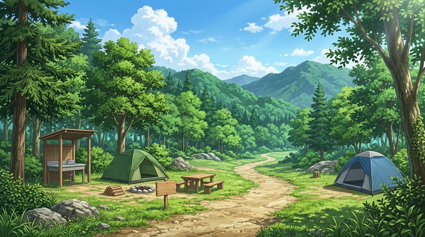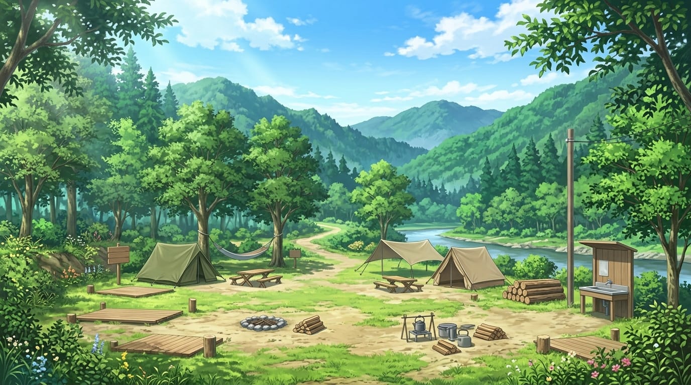 ■ キャンプ場のマンガ・アニメ背景イラスト(ダウンロード可)