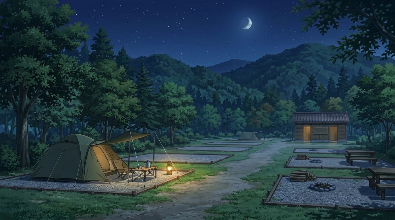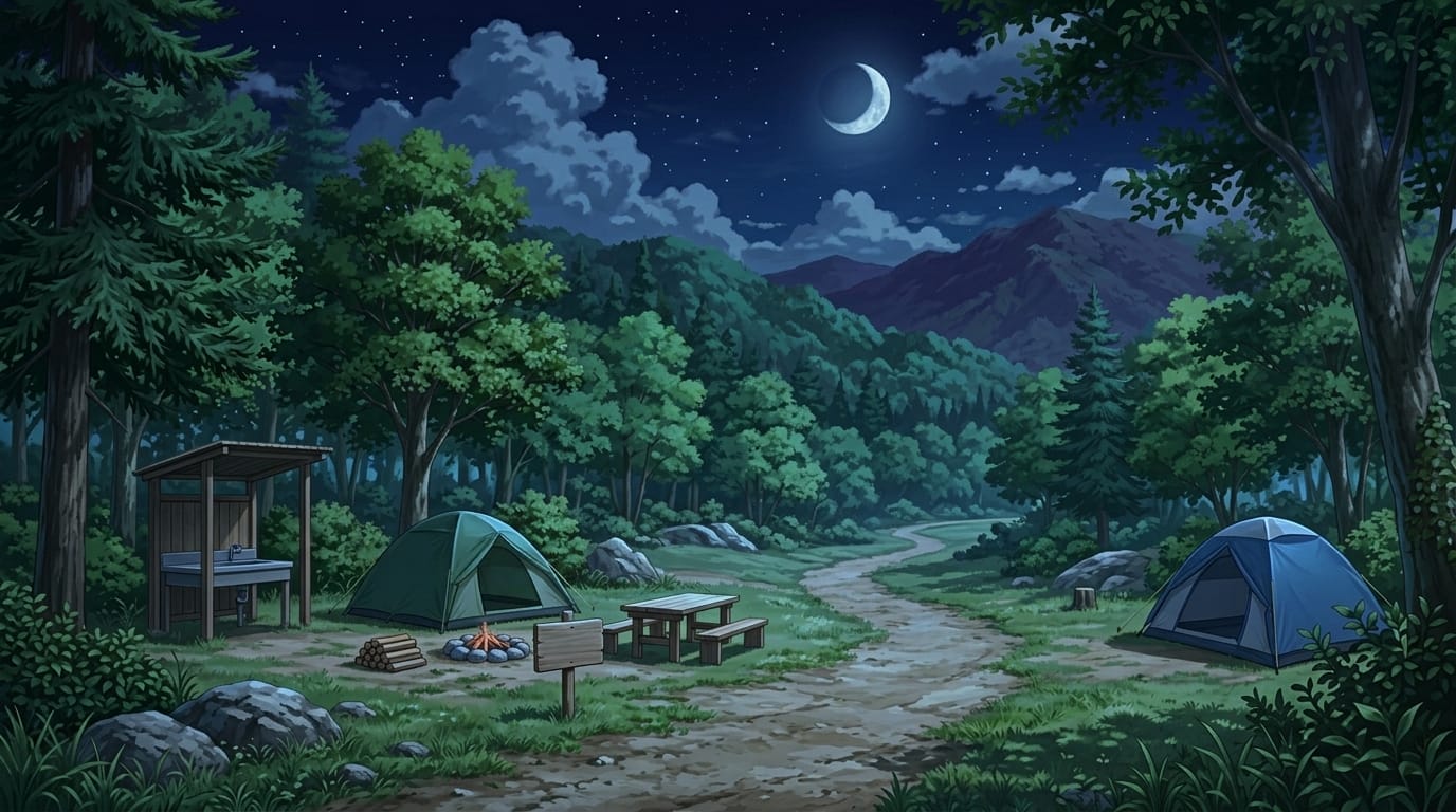 月明かりに包まれた静かな森のキャンプ場を表現した、幻想的な夜景演出に使いやすい背景イラスト素材です。