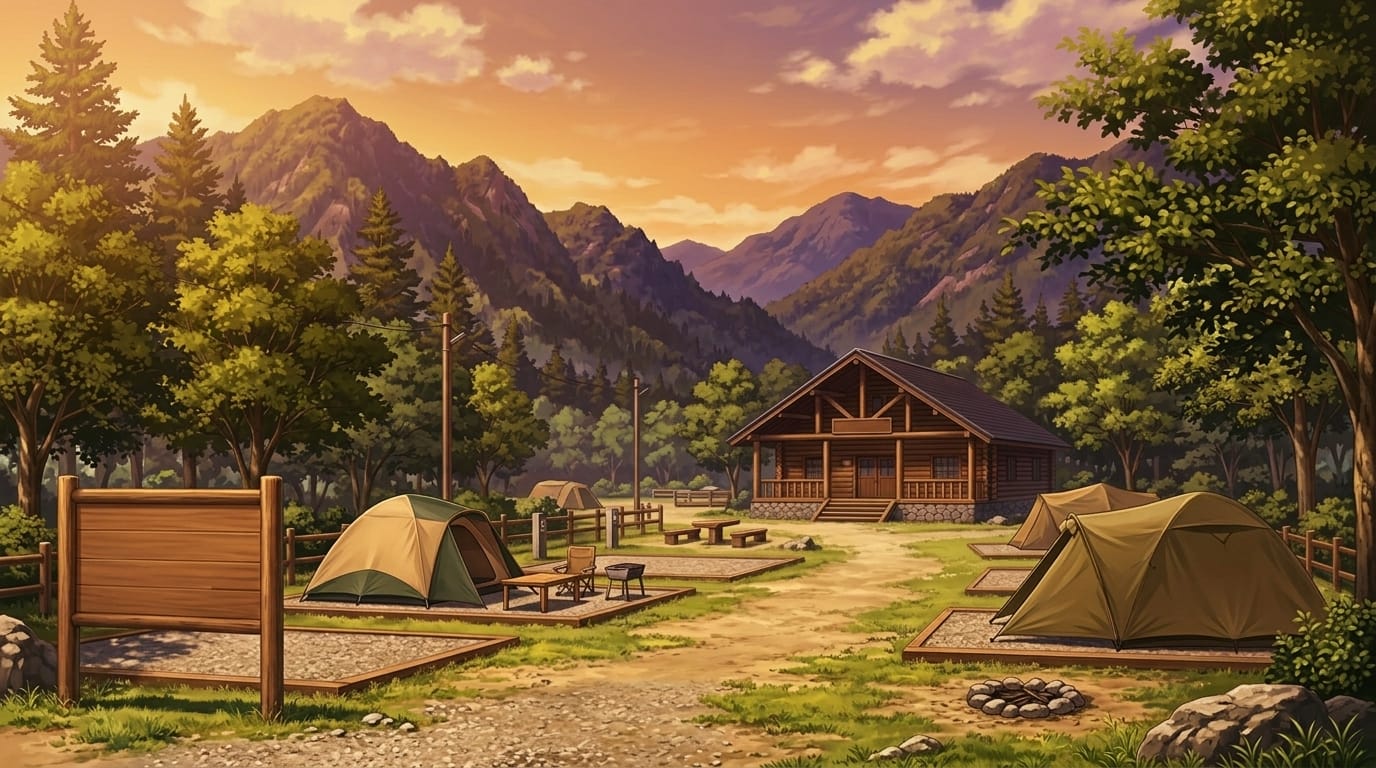 夕暮れの区画キャンプ場と管理棟|背景イラスト素材