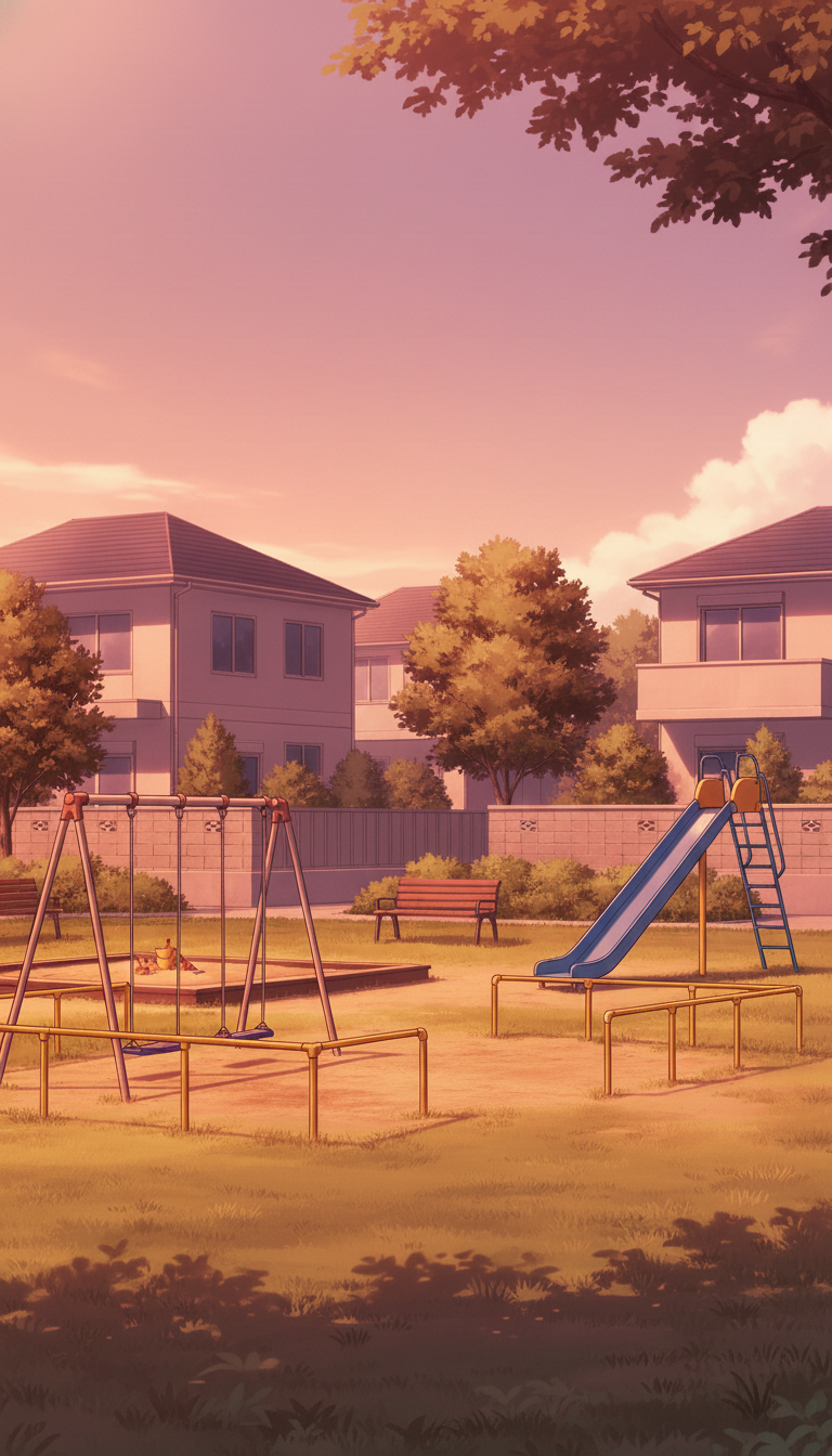 夕焼けに染まる住宅街の公園|放課後シーン向け遊具背景