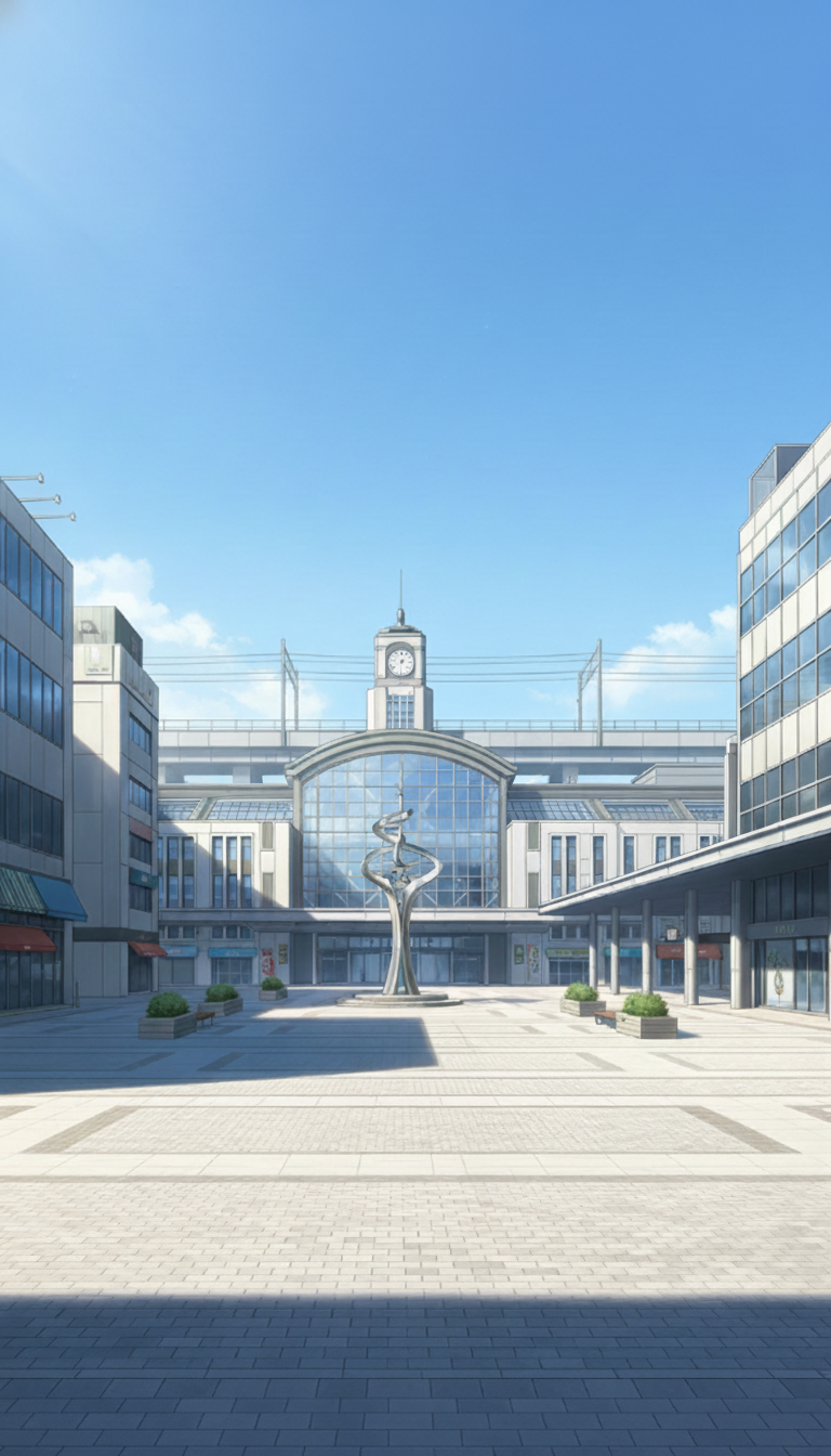 青空の下で時計台とモニュメントが映える、日常系アニメやゲームに使いやすい駅前ロータリーの背景です。