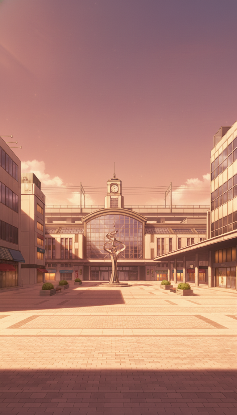 オレンジ色の夕日がビルと広場を包み込む、放課後や帰宅シーンにぴったりの駅前広場背景です。