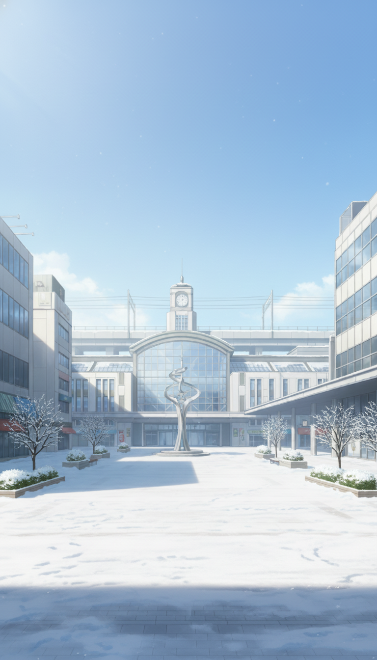 一面の雪と白い息が似合う澄んだ空気感を表現できる、冬の駅前広場の日常系背景です。