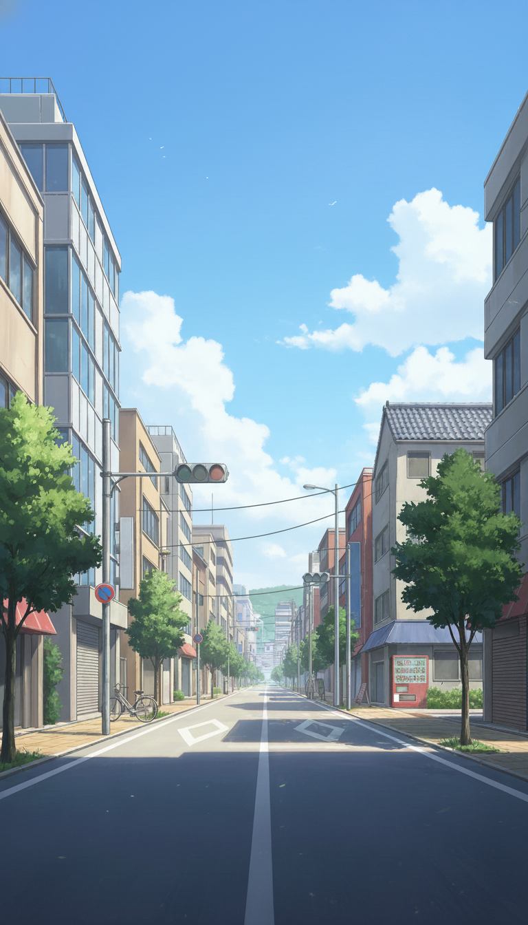 現代の街中の背景イラスト素材を無料配布。9:16の縦長構図でスマホ作品に使いやすい背景イラストです。漫画・Webtoonやゲーム背景として商用・トレース利用もOK!