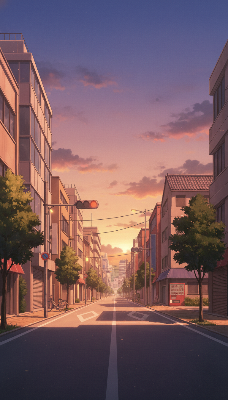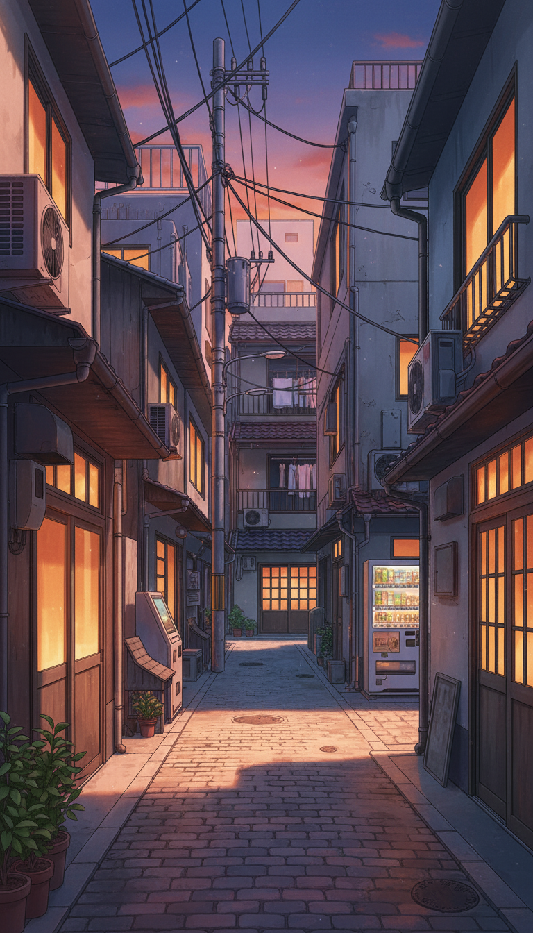 夕焼けの下町路地裏|ノスタルジックな放課後背景