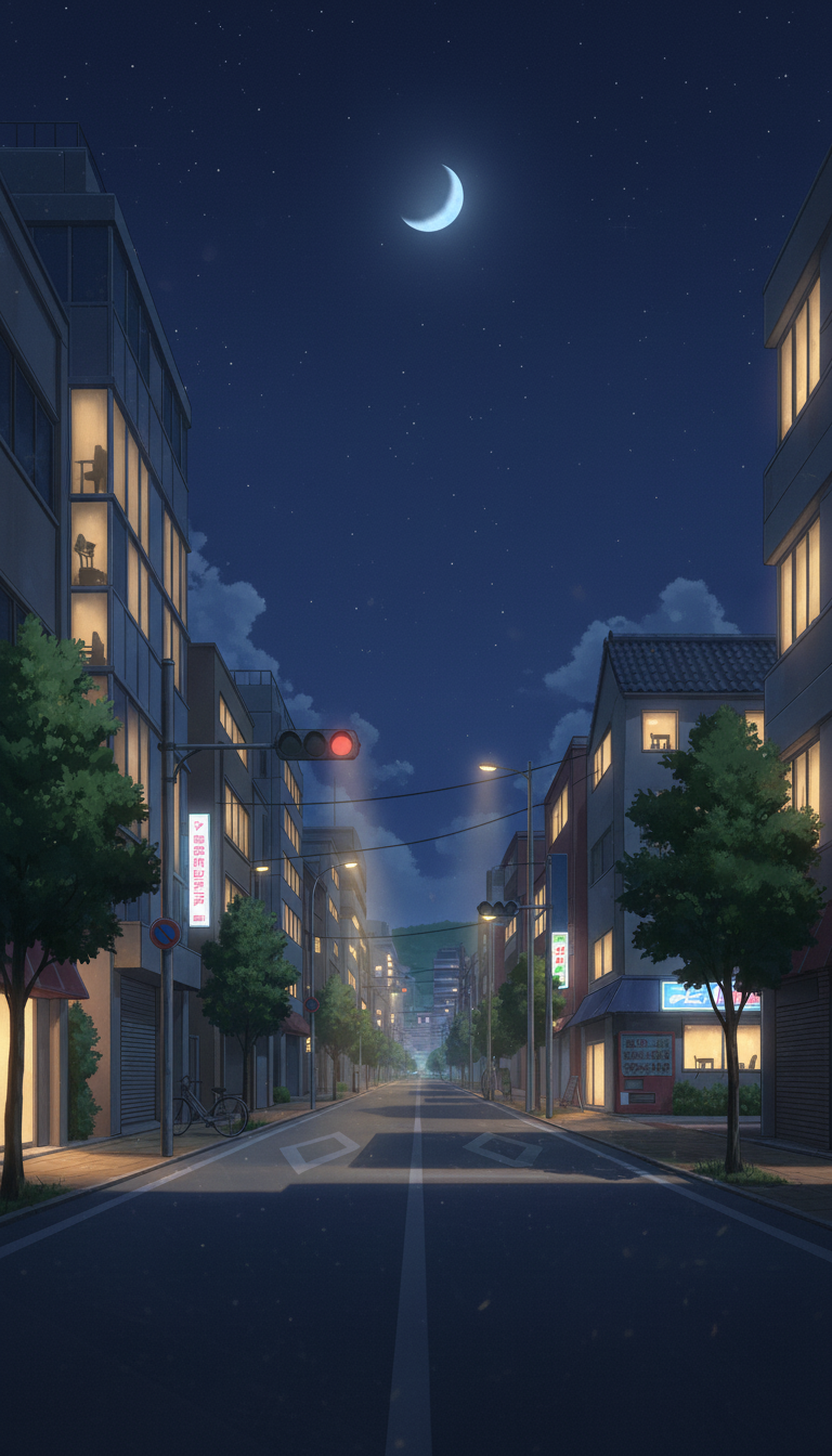 三日月の浮かぶ大通り|ナイトシーン街並み背景