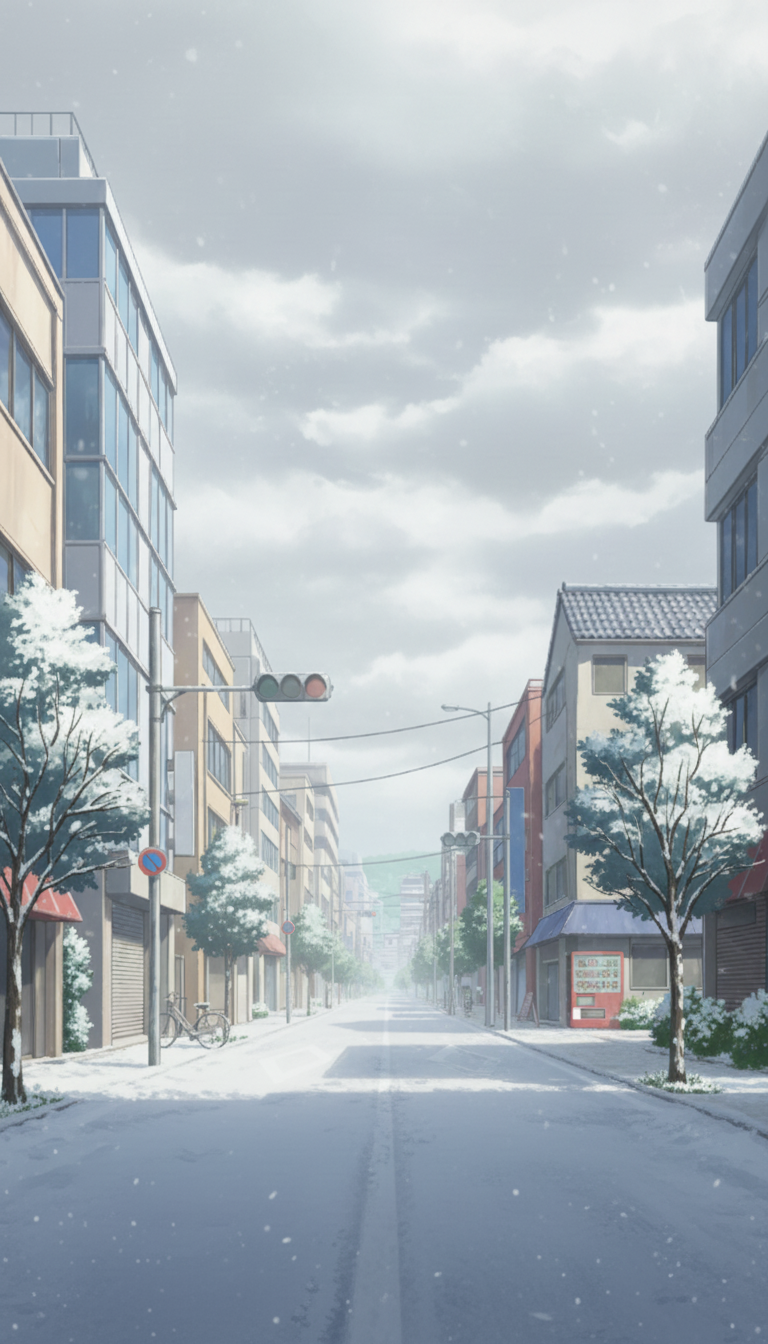 しんしんと雪が積もる人通りの少ない商店街を描いた、冬の日常シーンに使える道路背景です。
