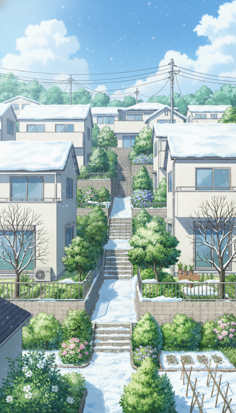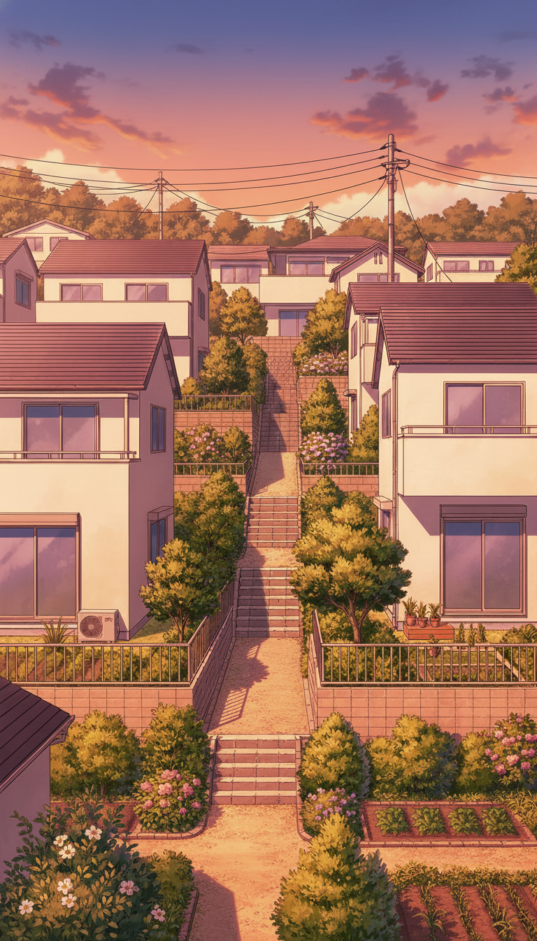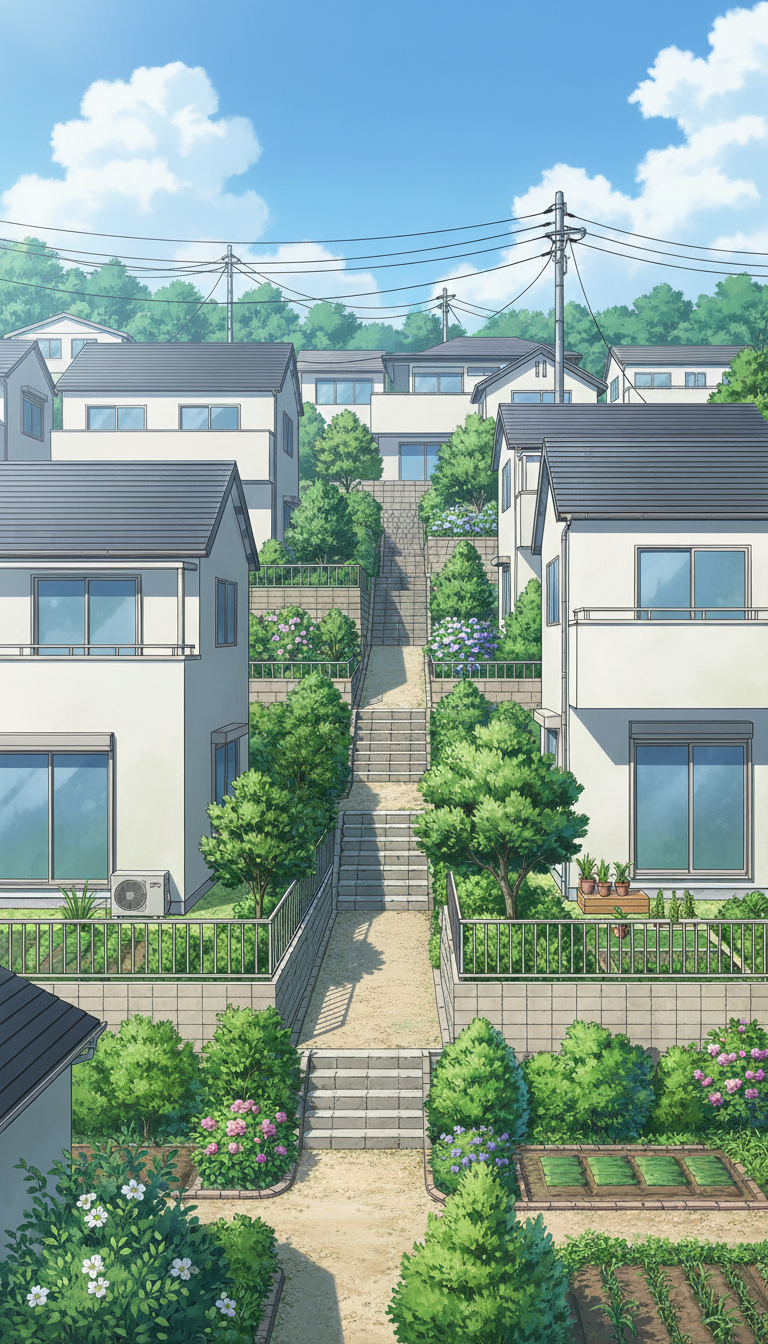 階段と植栽が立体感を生む閑静な住宅街で、日常系アニメの自宅周辺や通学路に最適な背景です。