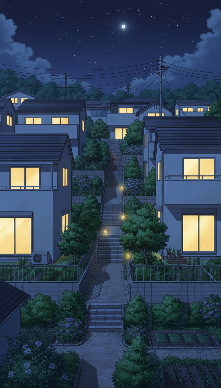 家々の明かりと足元の灯りが階段を照らす、静かな現代日本の住宅街夜景背景です。
