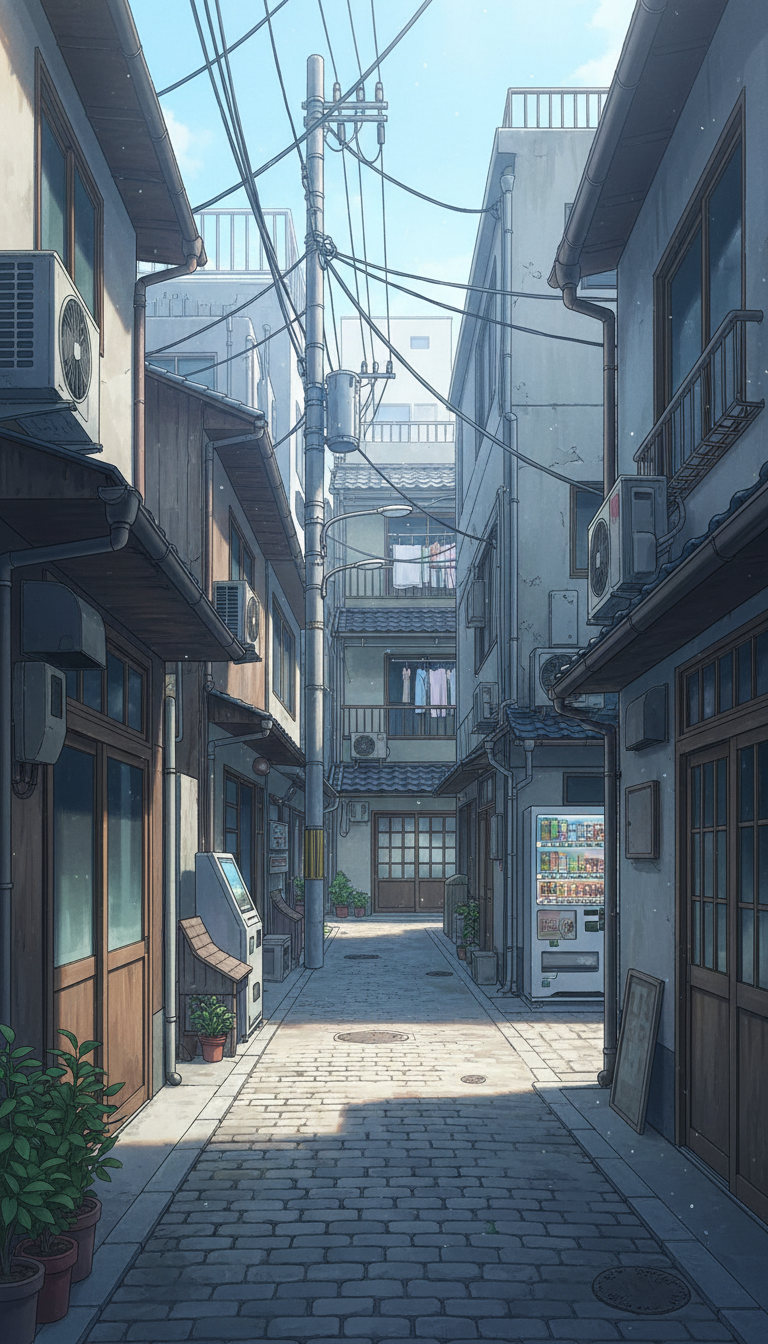 自販機や植木鉢が並ぶ石畳の細い路地が印象的な、下町の日常を描けるアニメ風背景です。