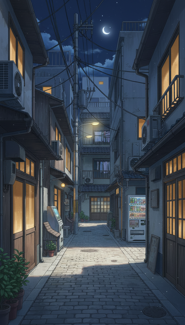 三日月の下町路地裏|夜の生活感あふれる街並み背景