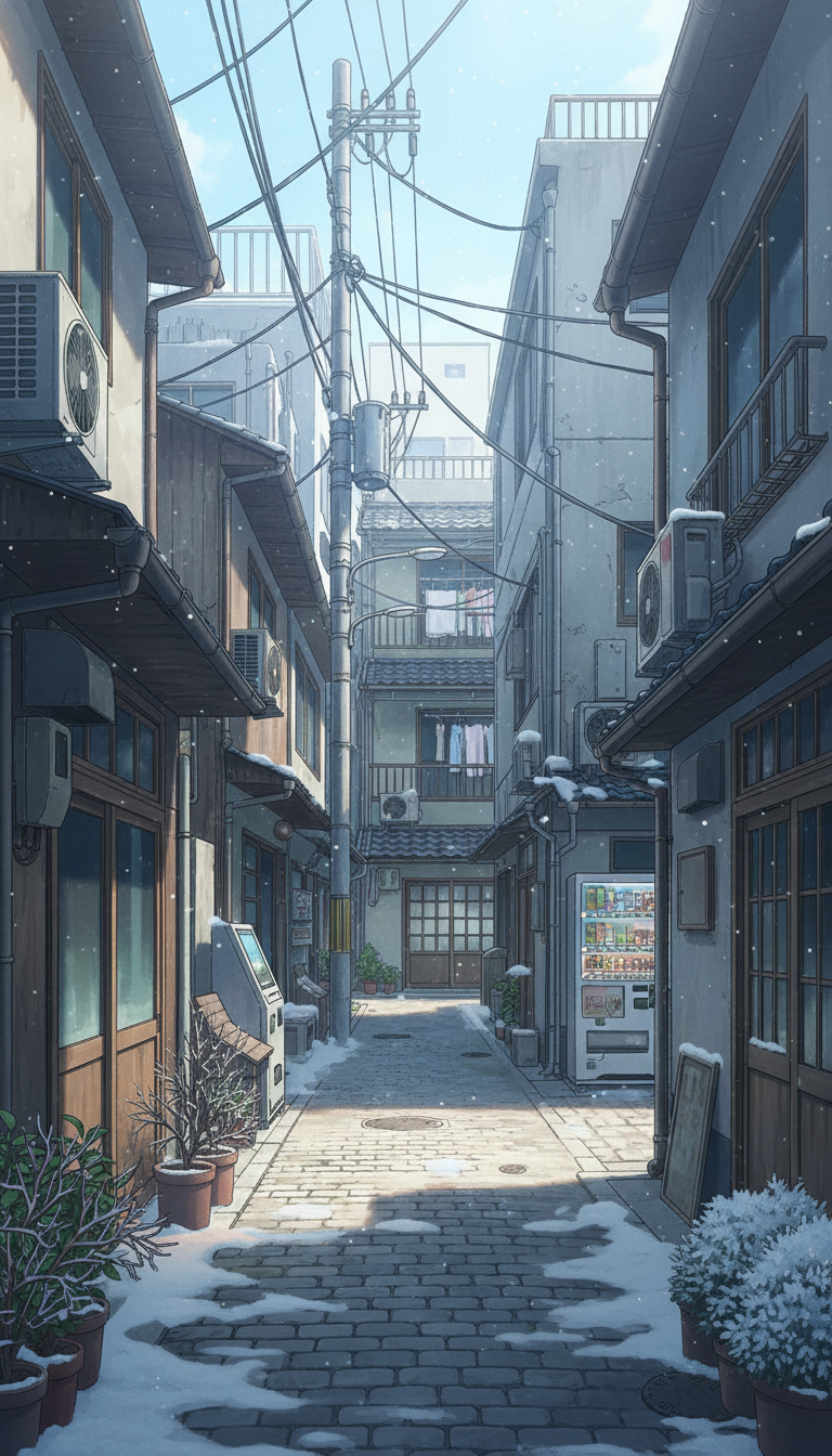 石畳や屋根に雪が積もる下町の細い路地を描いた、冬の日常系アニメにぴったりの背景です。