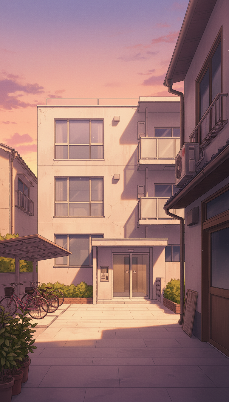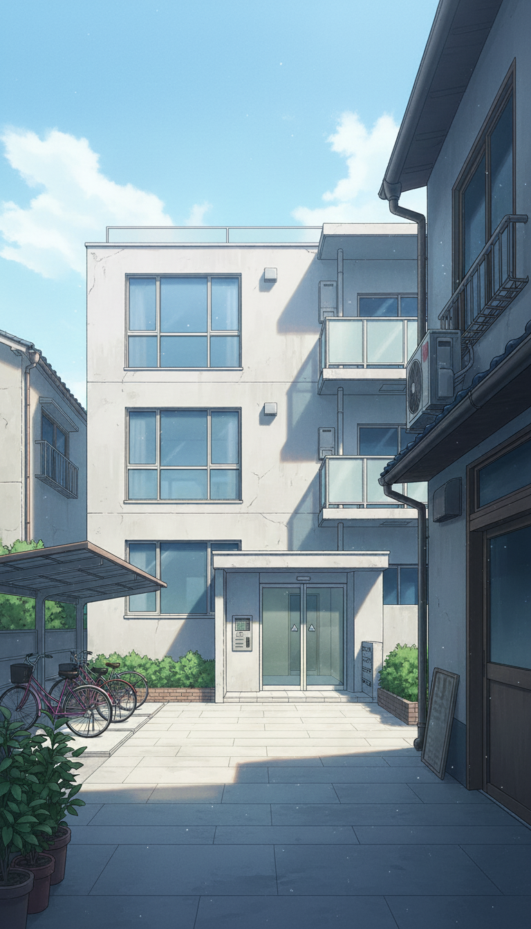 自転車と植木鉢が並ぶコンパクトなマンション入口を描いた、現代日本の日常シーン向け背景です。