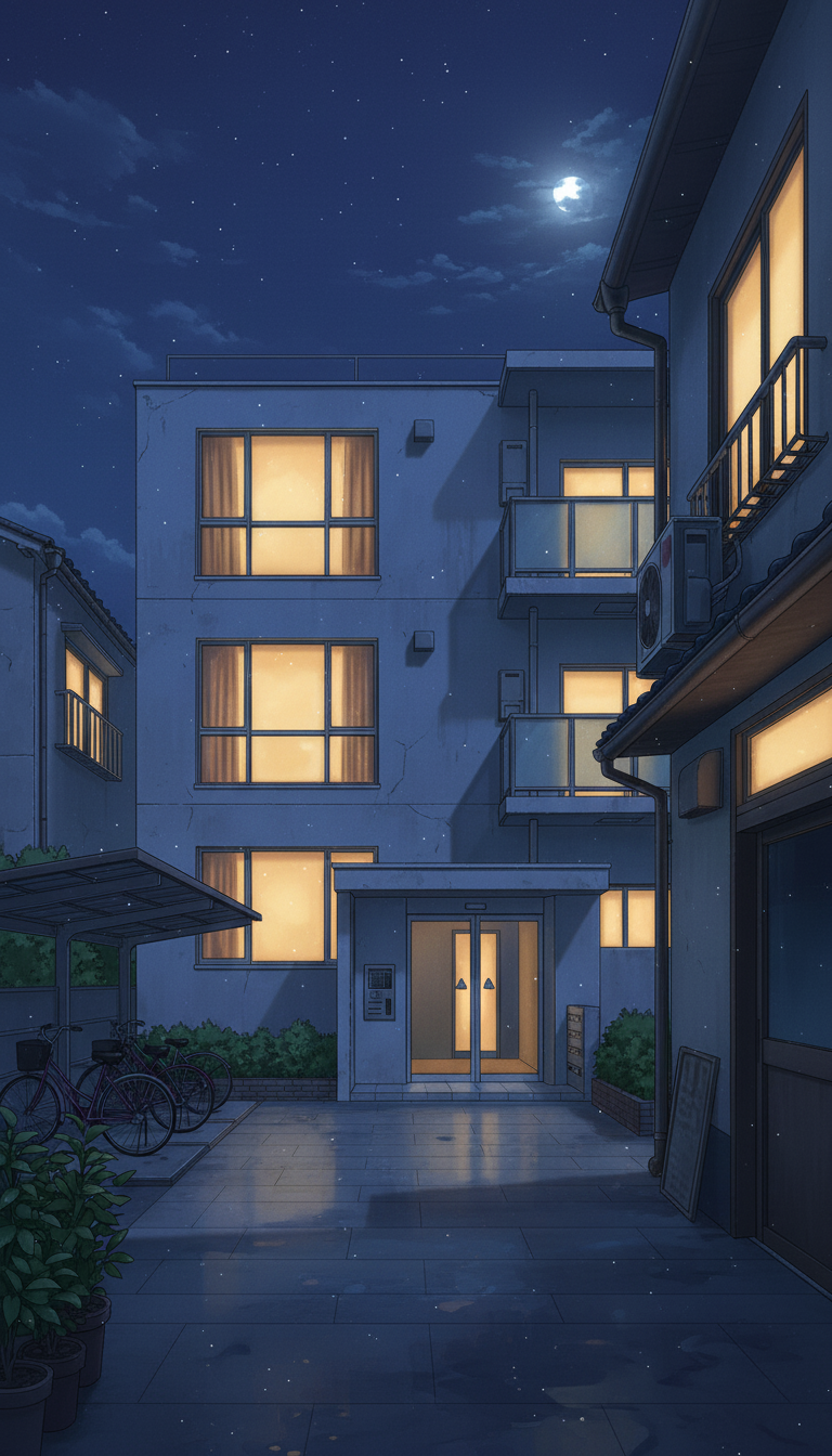 窓明かりと濡れた床の反射が美しいマンションの中庭を描いた、夜の会話や別れのシーン向け背景です。