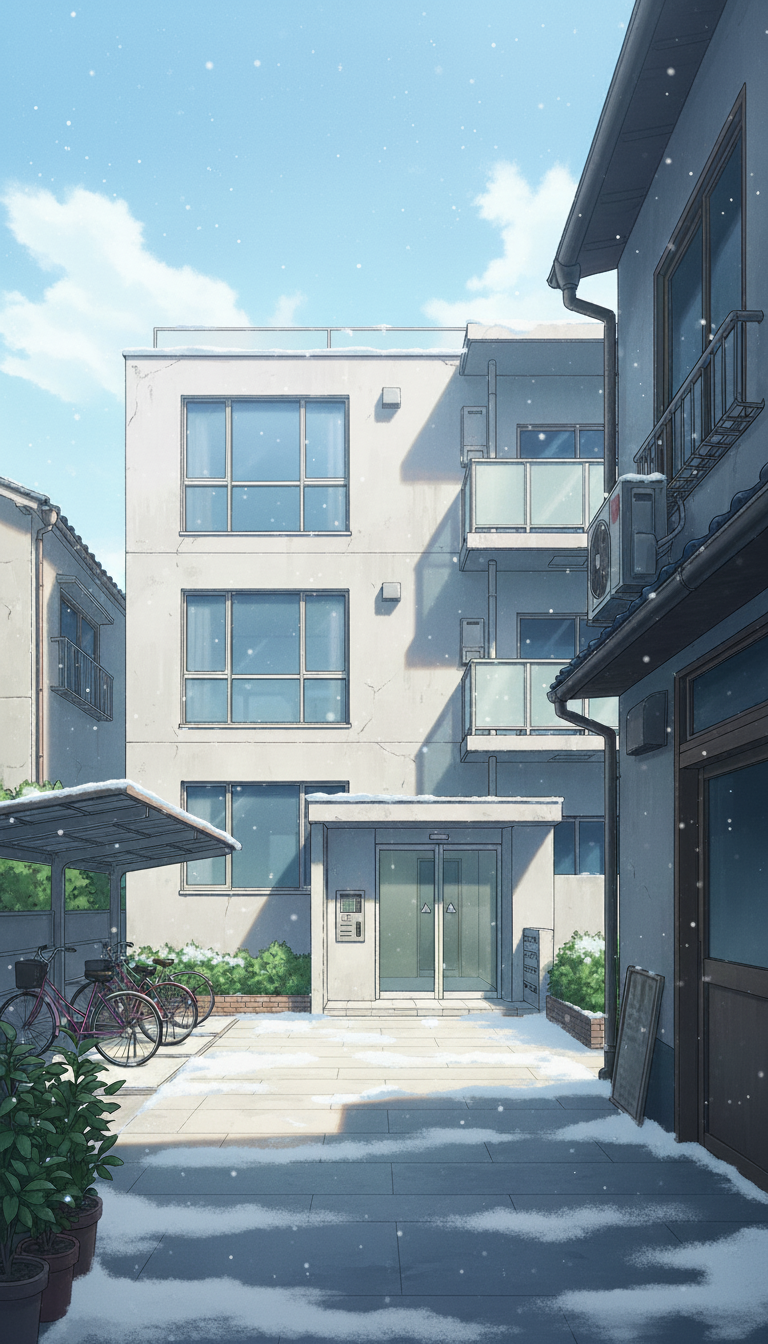 うっすらと雪が積もったタイル敷きの中庭が特徴的な、冬の朝や休日を描けるマンション前背景です。