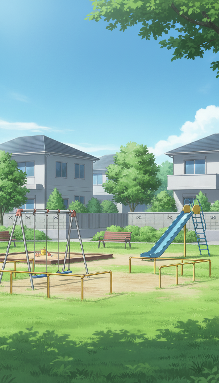 青空の下でブランコやすべり台が映える、現代日本の住宅街にある日常系公園背景です。