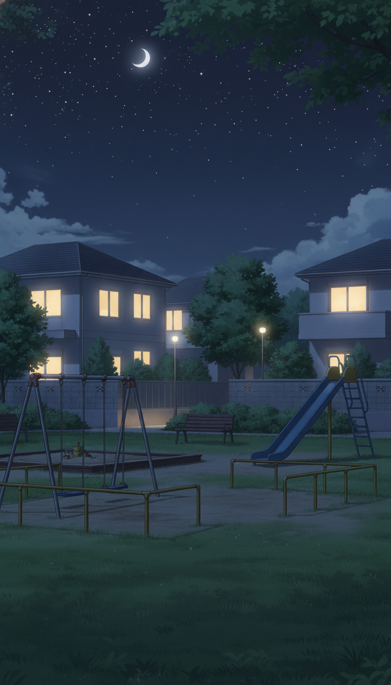 三日月と街灯の光に包まれた静かな公園で、夜の会話シーンや感情表現にぴったりの背景です。