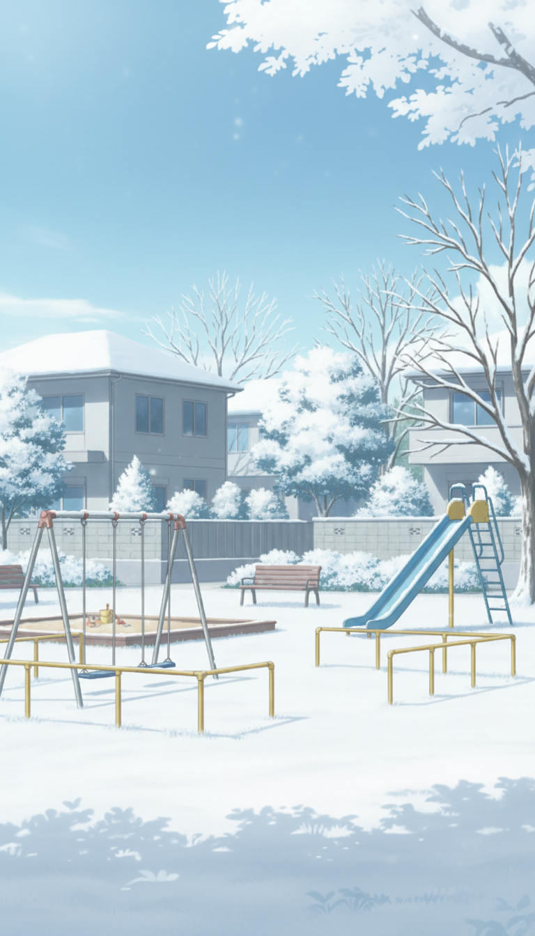 一面の雪に覆われたブランコやすべり台が印象的な、冬の日常シーンを描ける公園背景です。