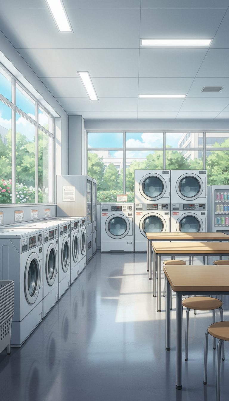 大きな窓から光が差し込む明るい店内で、洗濯機や乾燥機が整然と並ぶ現代的なコインランドリー背景です。
