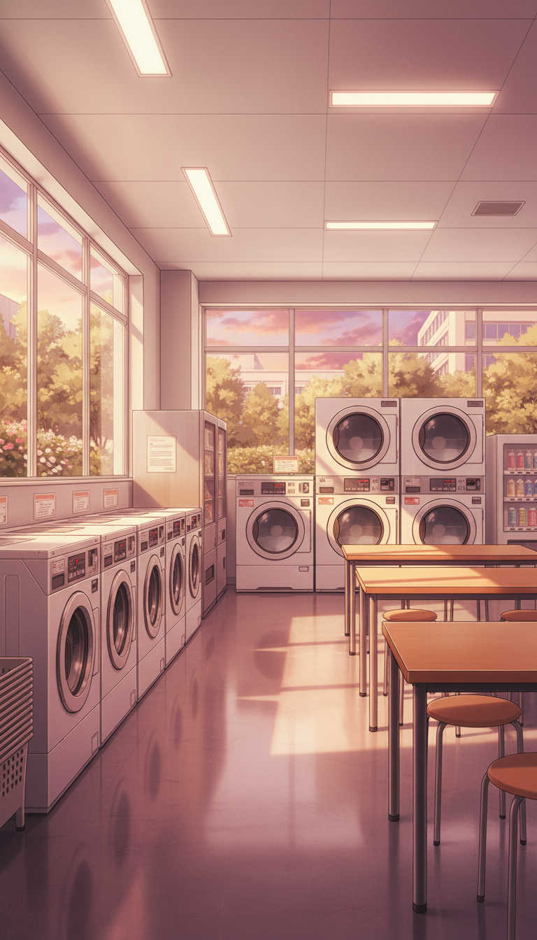 夕暮れのコインランドリー|暮れゆく街を望む日常背景