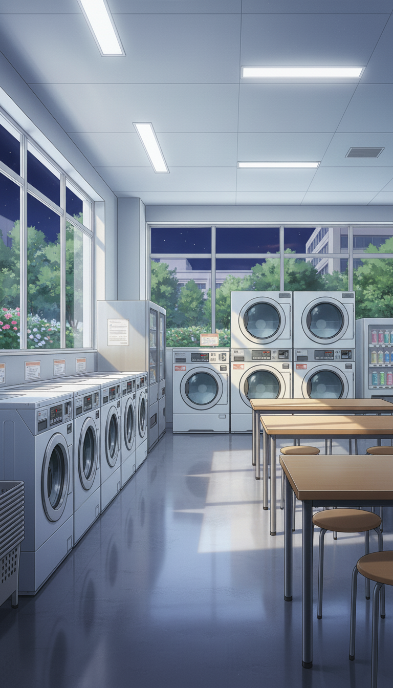 夜のコインランドリー店内|星空が見える日常系背景