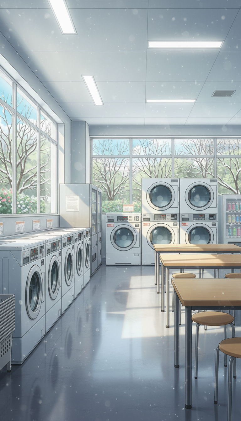 冬のコインランドリー店内|雪景色が見える生活感背景