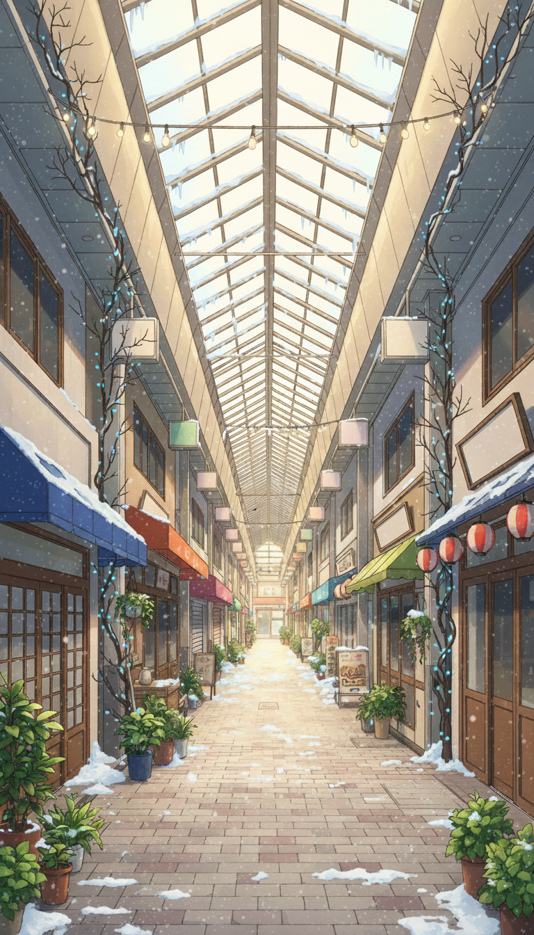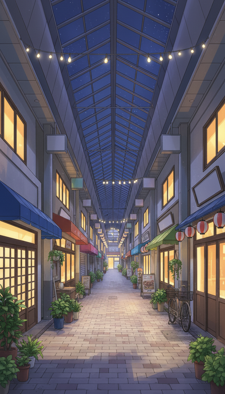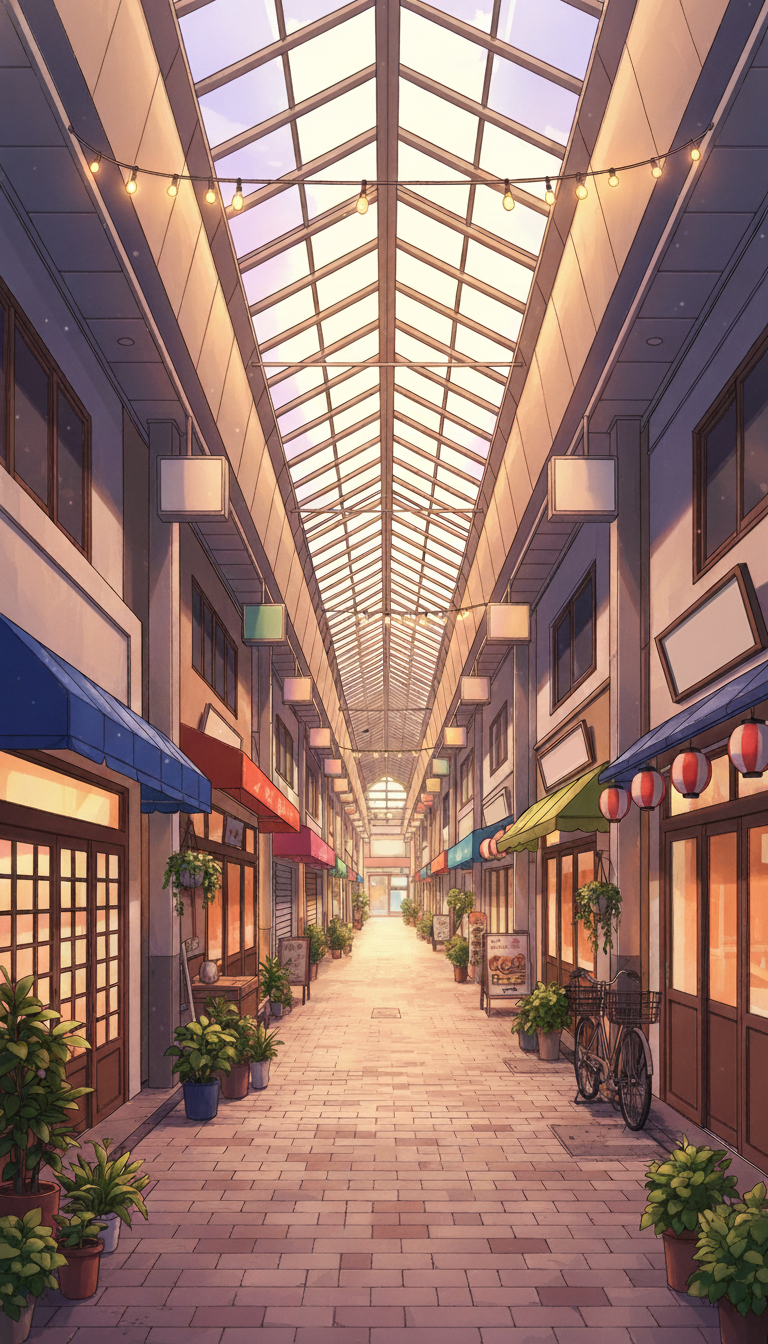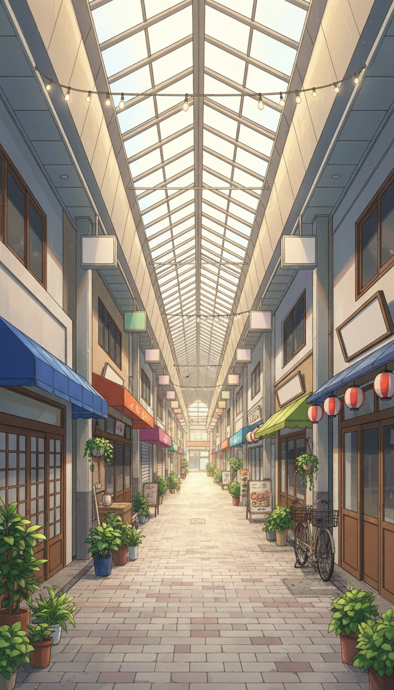 ガラス張りの屋根から光が差し込み、植木鉢や看板が並ぶ、現代日本のアーケード商店街を描いた背景です。