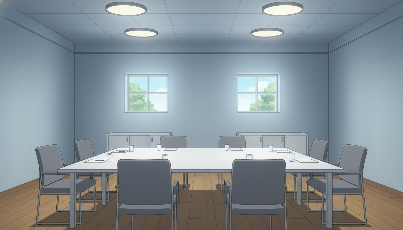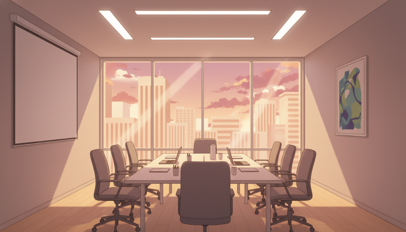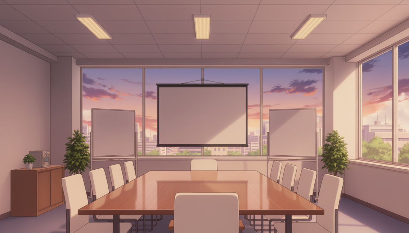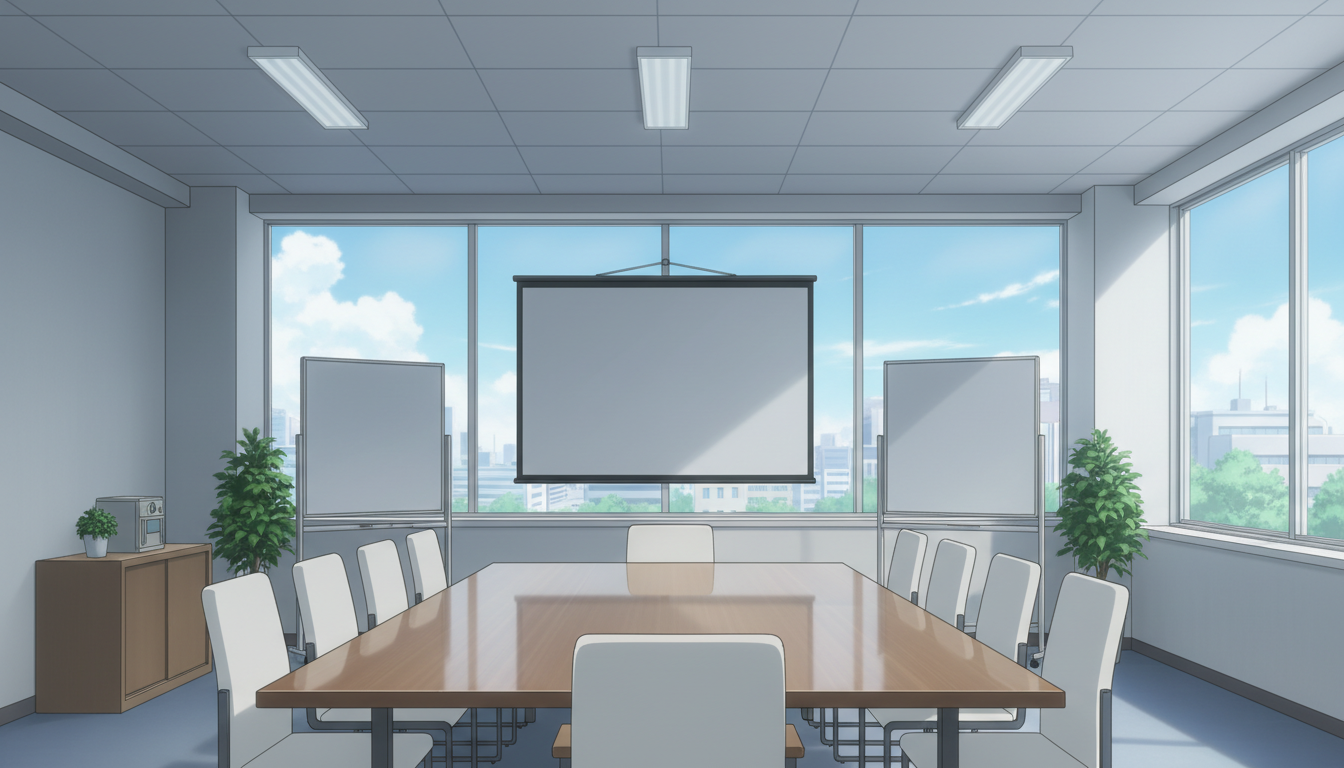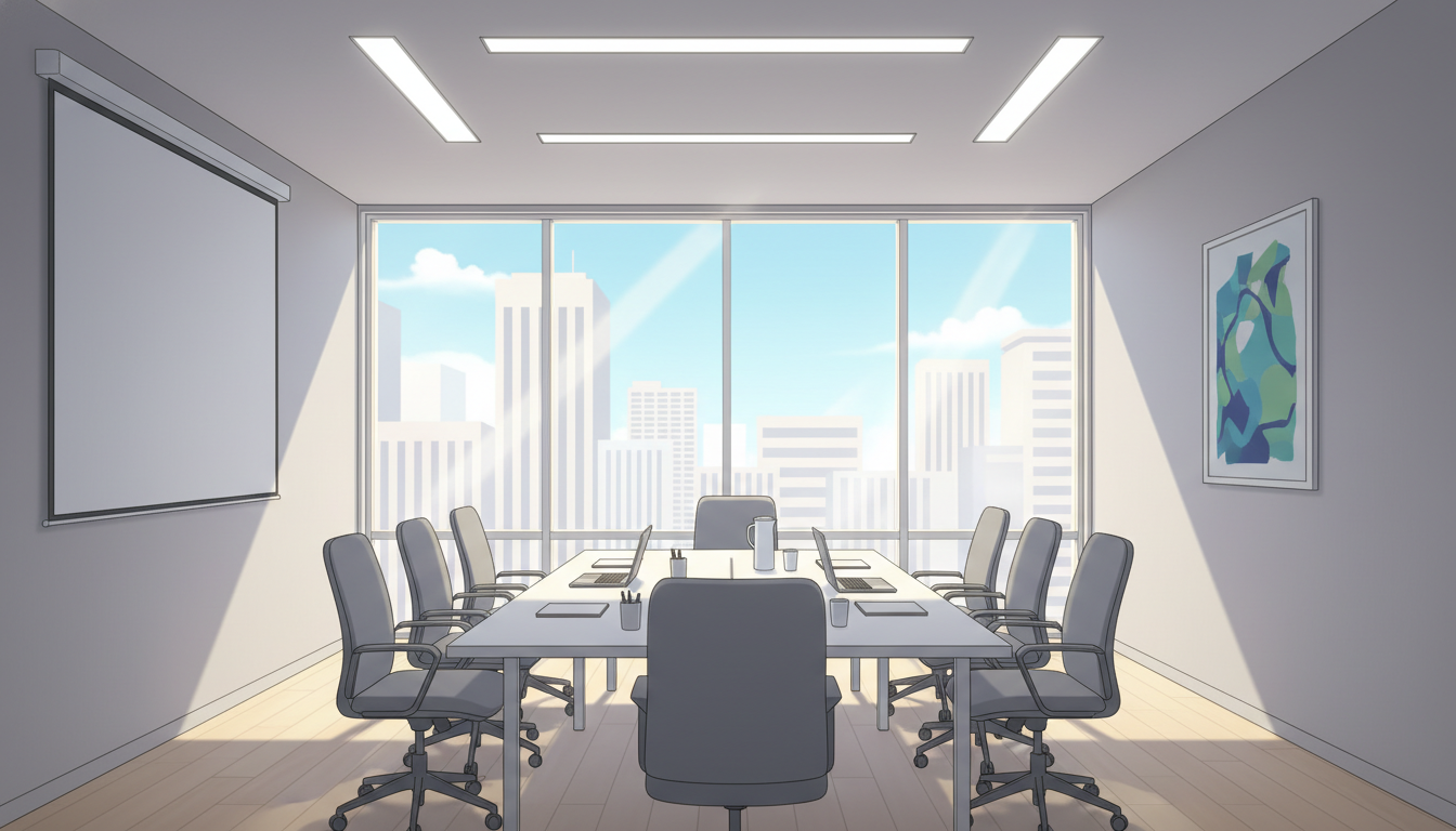 会議室の背景イラスト素材を無料配布。16:9の横長構図でPC向け作品に使いやすい背景イラストです。漫画・Webtoonやゲーム背景として商用・トレース利用もOK!