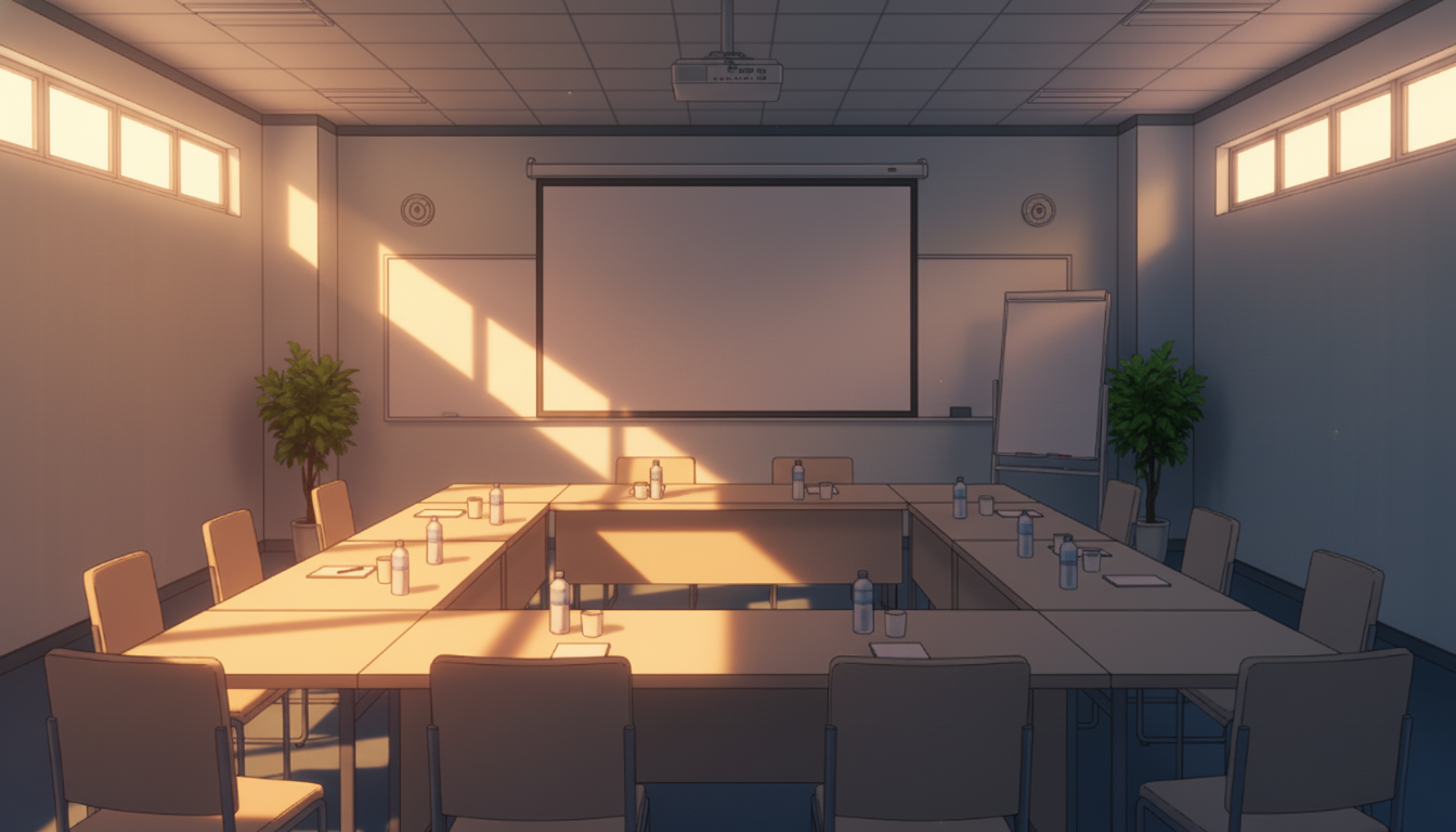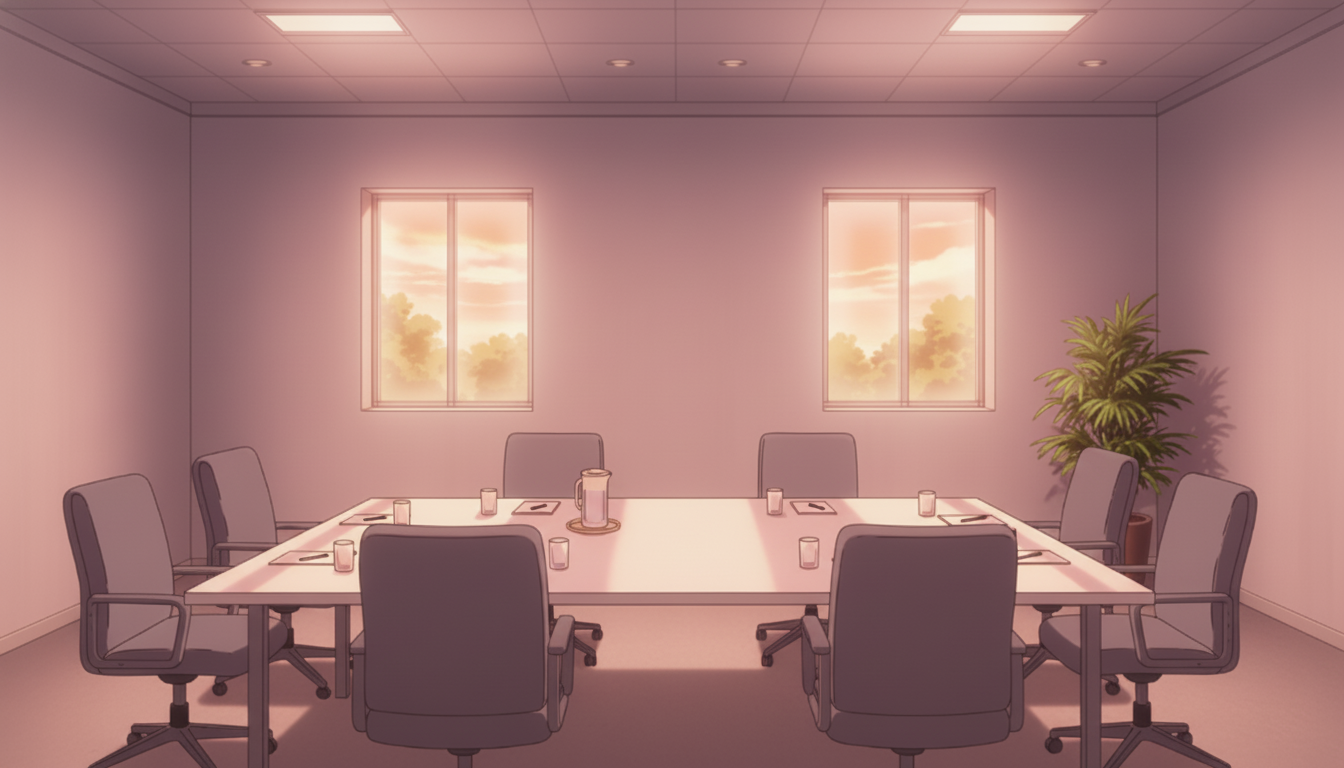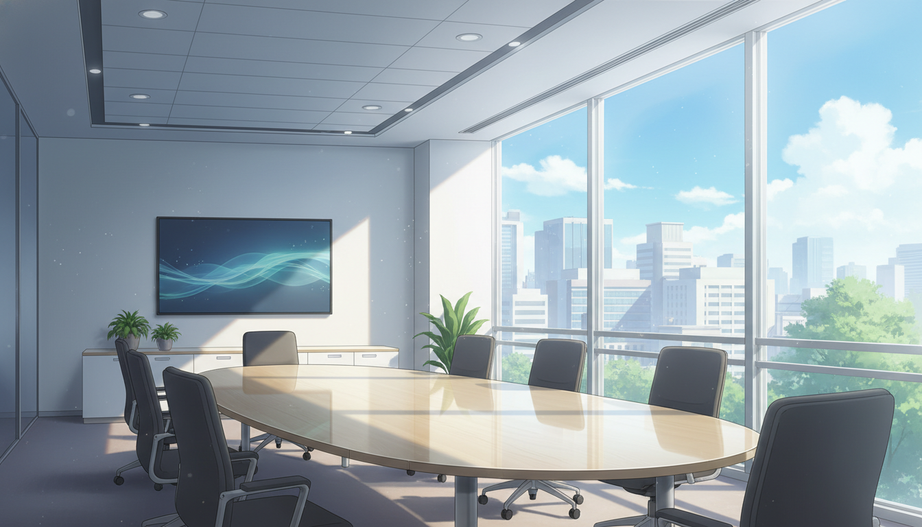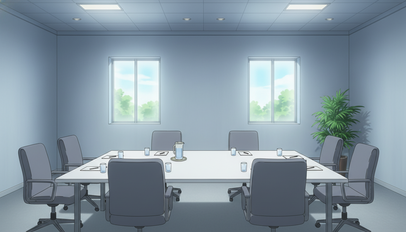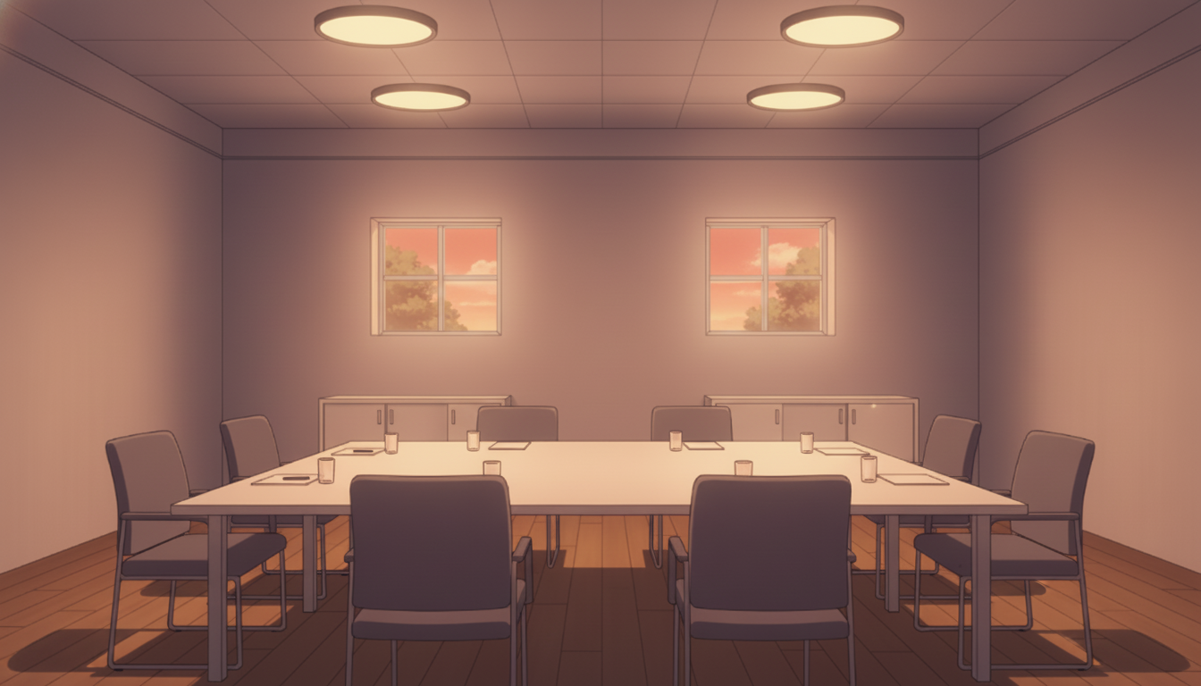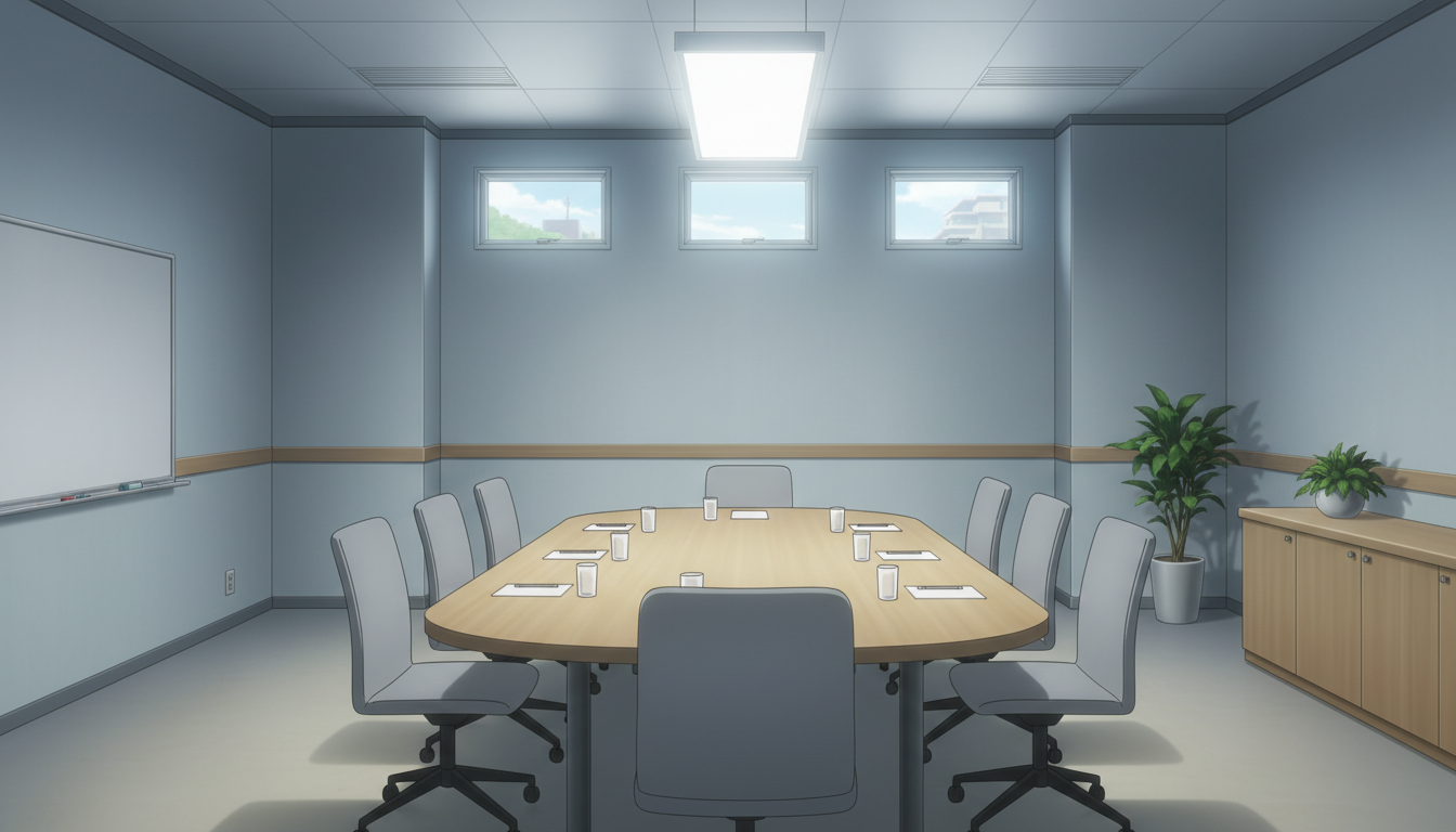 会議室の背景イラスト素材を無料配布。16:9の横長構図でPC向け作品に使いやすい背景イラストです。漫画・Webtoonやゲーム背景として商用・トレース利用もOK!
