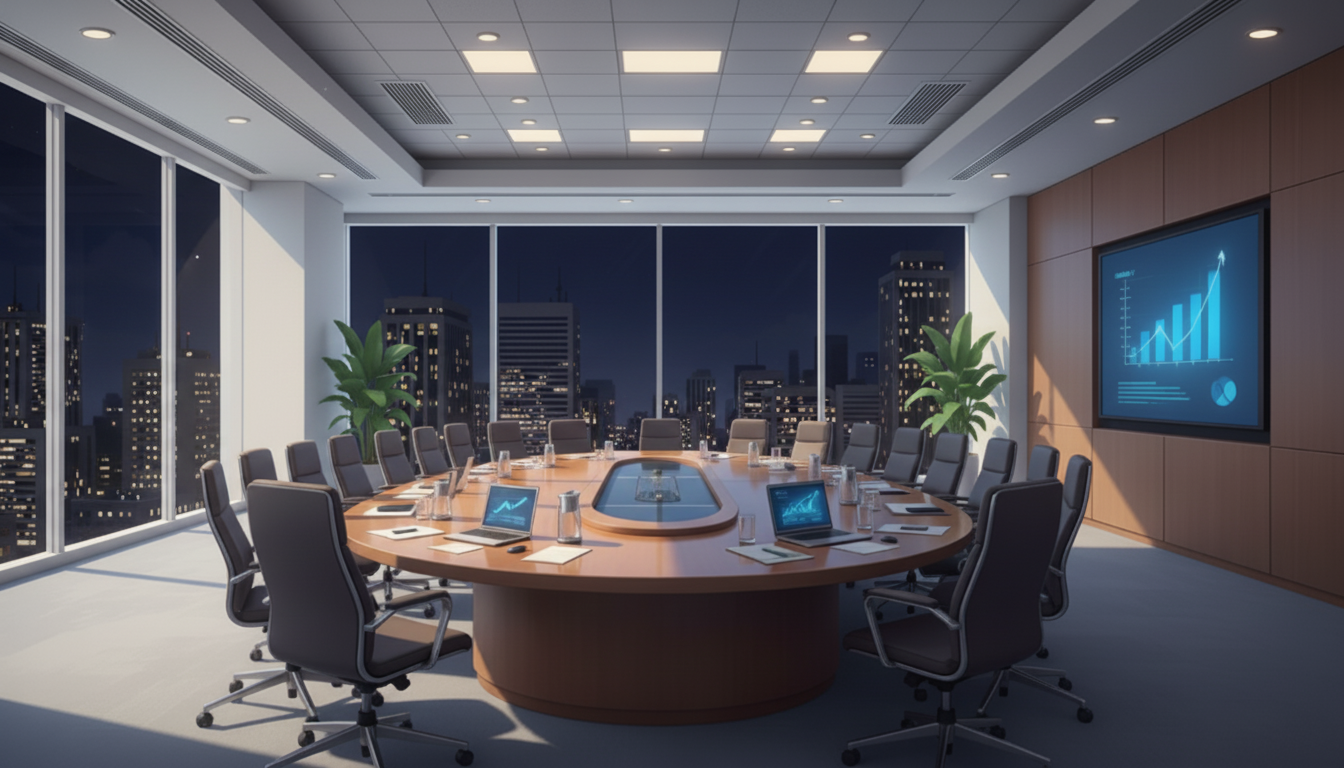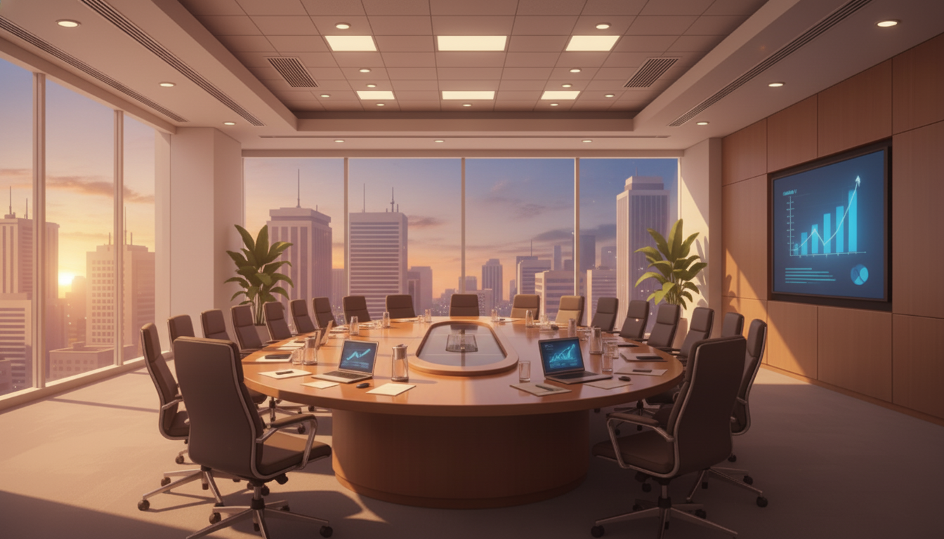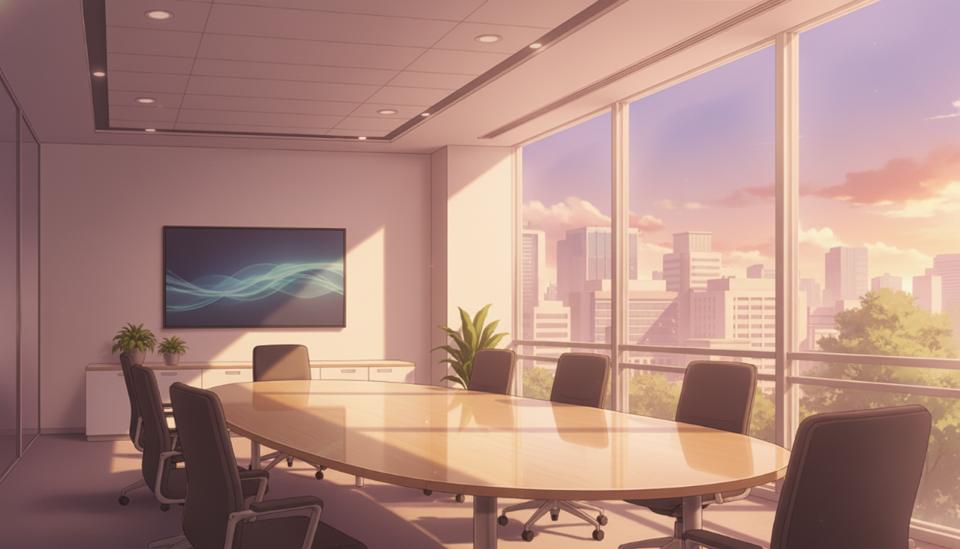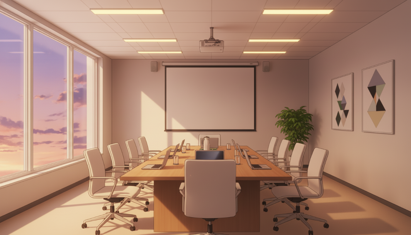 夕方のビジネス会議室|温かい照明と落ち着いた雰囲気
