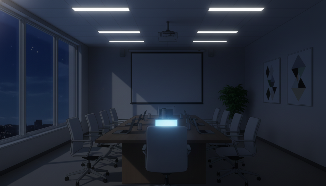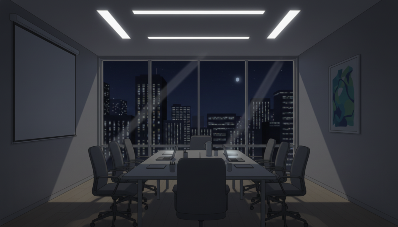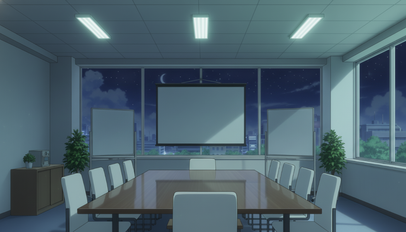 夜のプレゼンルーム|蛍光灯と月光の調和