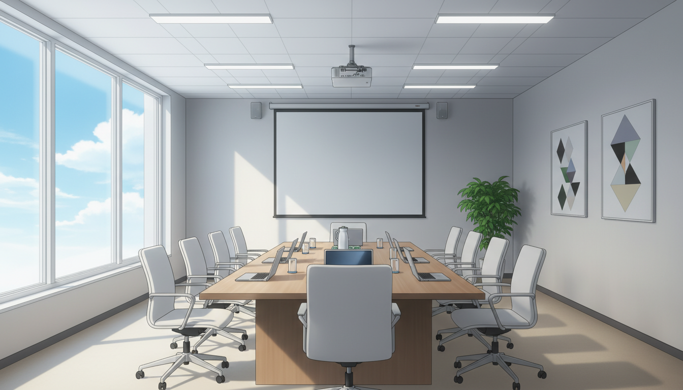 自然光がスクリーンを柔らかく照らす、清潔感あふれるビジネス向けの会議室背景です。
