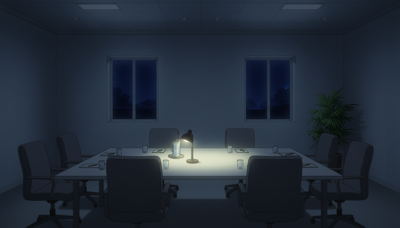 天井の明かりだけが優しく照らす、夜の会議や遅くまで残る仕事シーンに最適な背景です。
