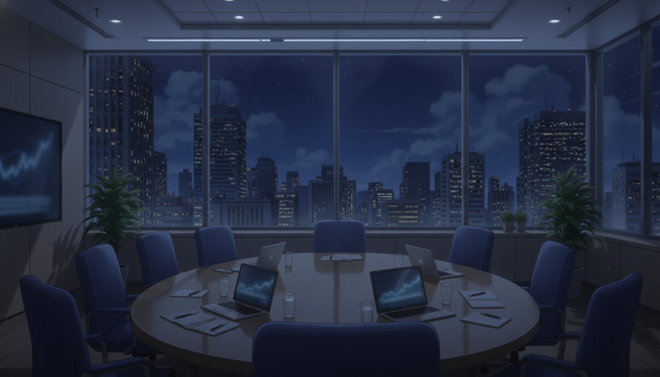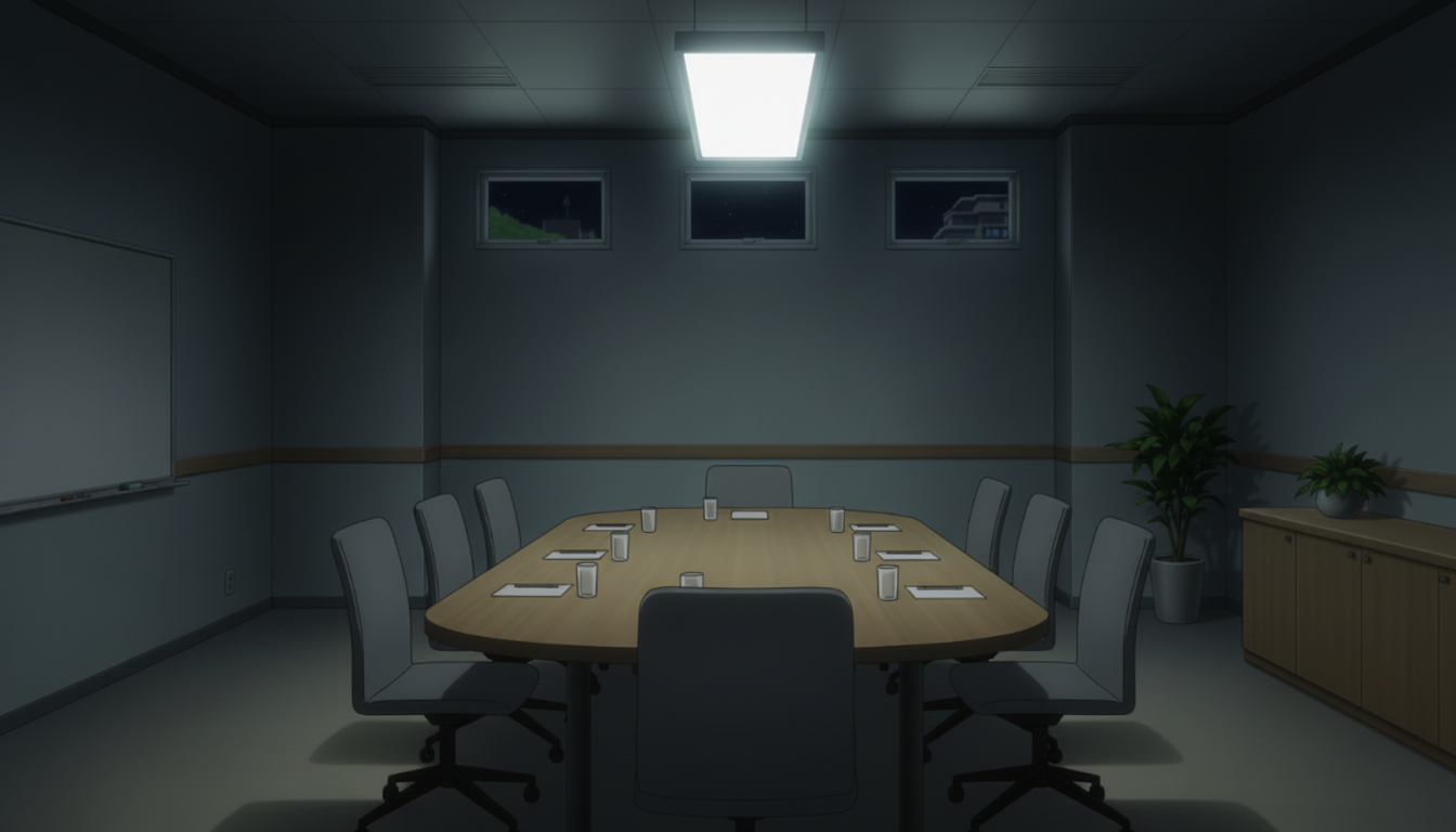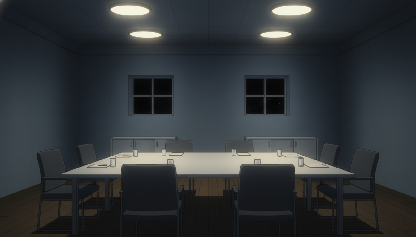 夜の静けさと室内の灯りが調和した、深夜の会議や報告シーンにぴったりの背景です。
